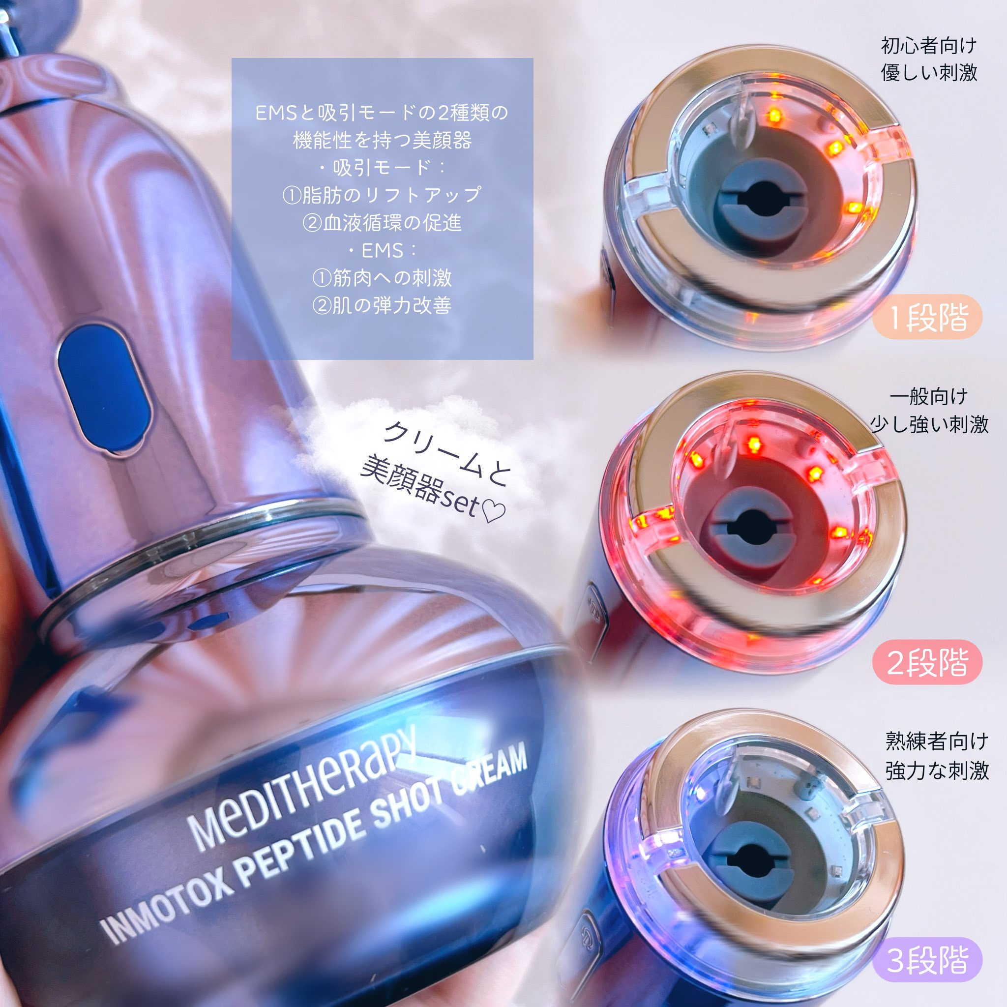 #PR#meditherapy インモトックス小顔リフトアップペプチドショットクリームインモトックス小顔リフトアップ吸引ジェットメディテラピーの美顔器は赤いタイプのを使ったことがあるんだけど、こちらは吸引ジェット!EMSと吸引モードの2種類の...
