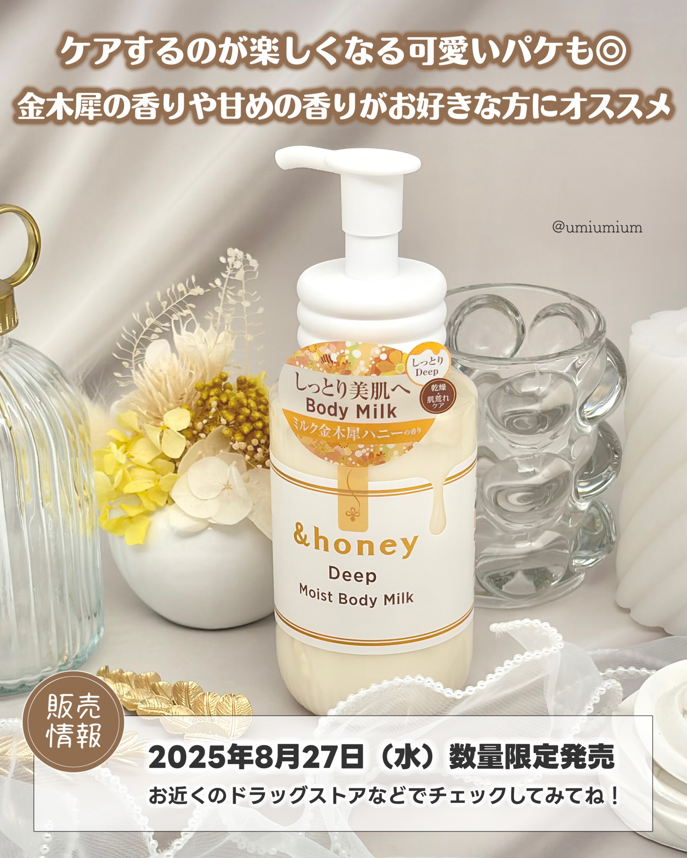 アンドハニーディープモイストボディミルクミルク金木犀ハニーの香りハチミツ美容コンセプトのアンドハニーのボディケアからボディミルクが新発売🍯🐝3つの保湿成分(*)がカサつきや肌あれをしつこく繰り返す肌を保湿🫧濃密セラミドハニー(*1)配合で、肌...
