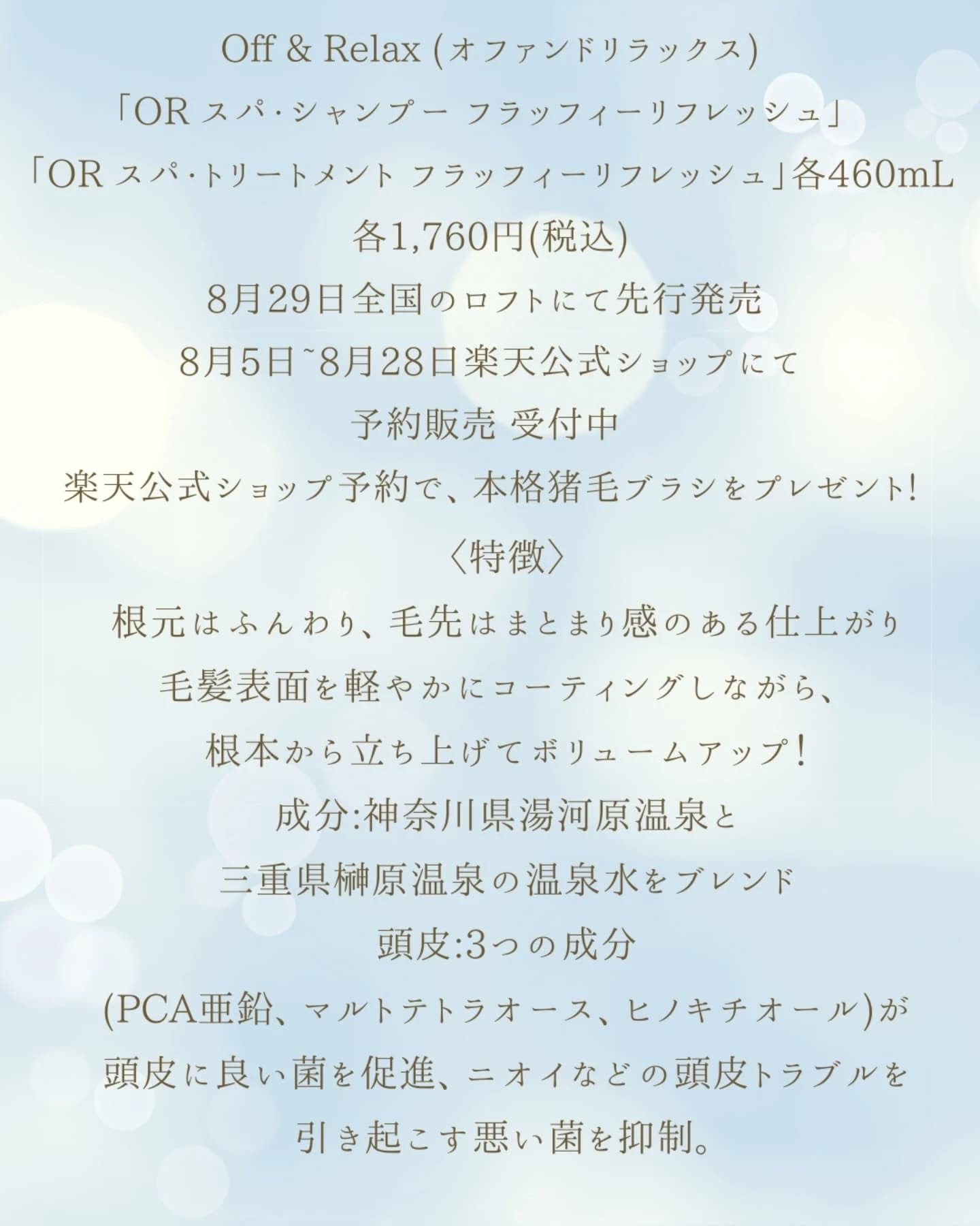 Off&Relaxブランド初のリニューアル!@or.japanORスパ・シャンプーフラッフィーリフレッシュ&ORスパ・トリートメントフラッフィーリフレッシュがボトルから処方まで全面的にパワーアップしました😌︎✦︎︎︎︎︎︎︎☑︎8月29日から...