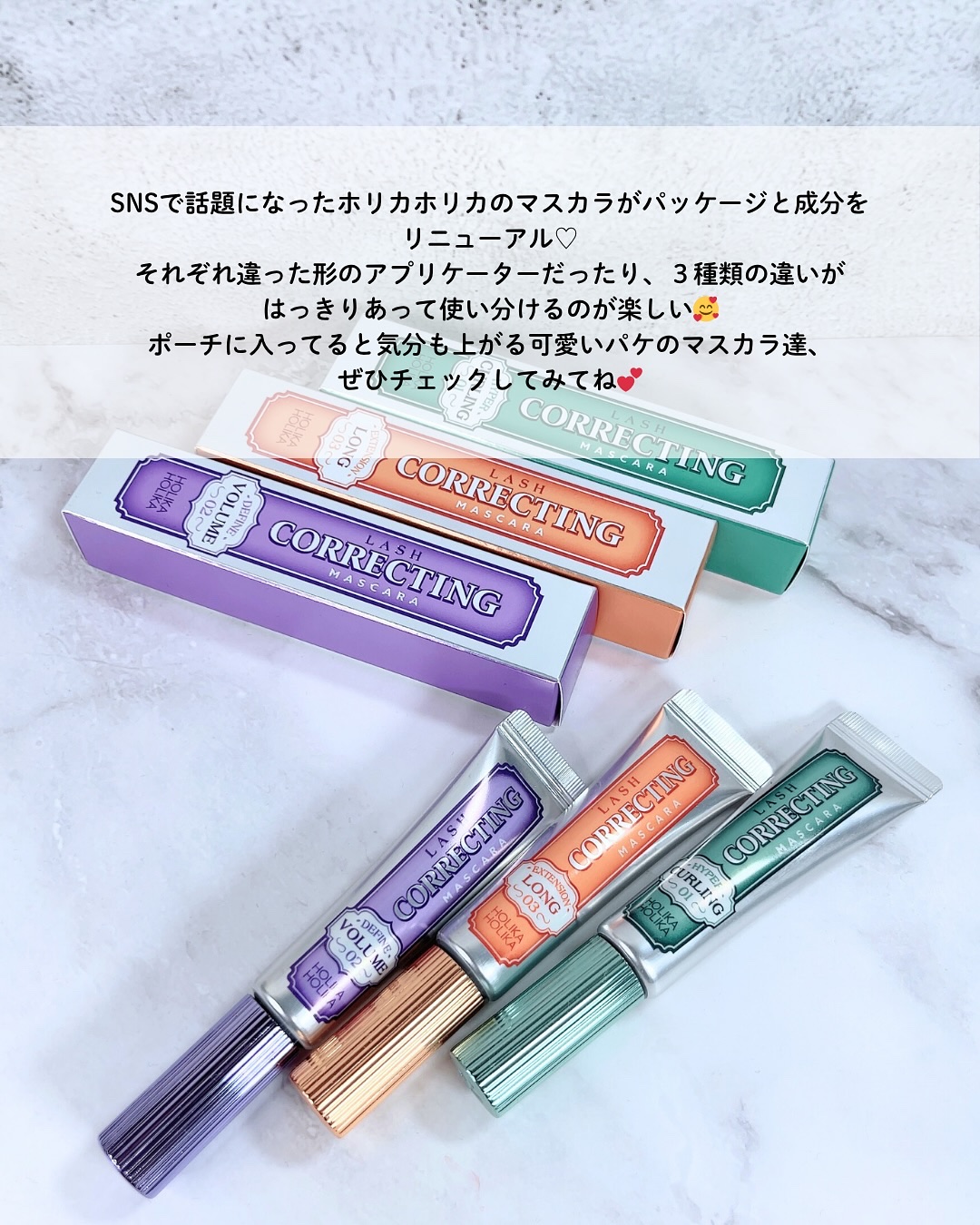 リニューアルしたHOLIKAHOLIKAマスカラ💗ラッシュコレクティングマスカラ3種🟩01ハイパーカール1番軽くて速乾ナチュ盛りまつげに。🟪02ディファインボリュームバチバチ存在感ある束感まつげ作るならこれ。🟧03ロングエクステンションCカー...