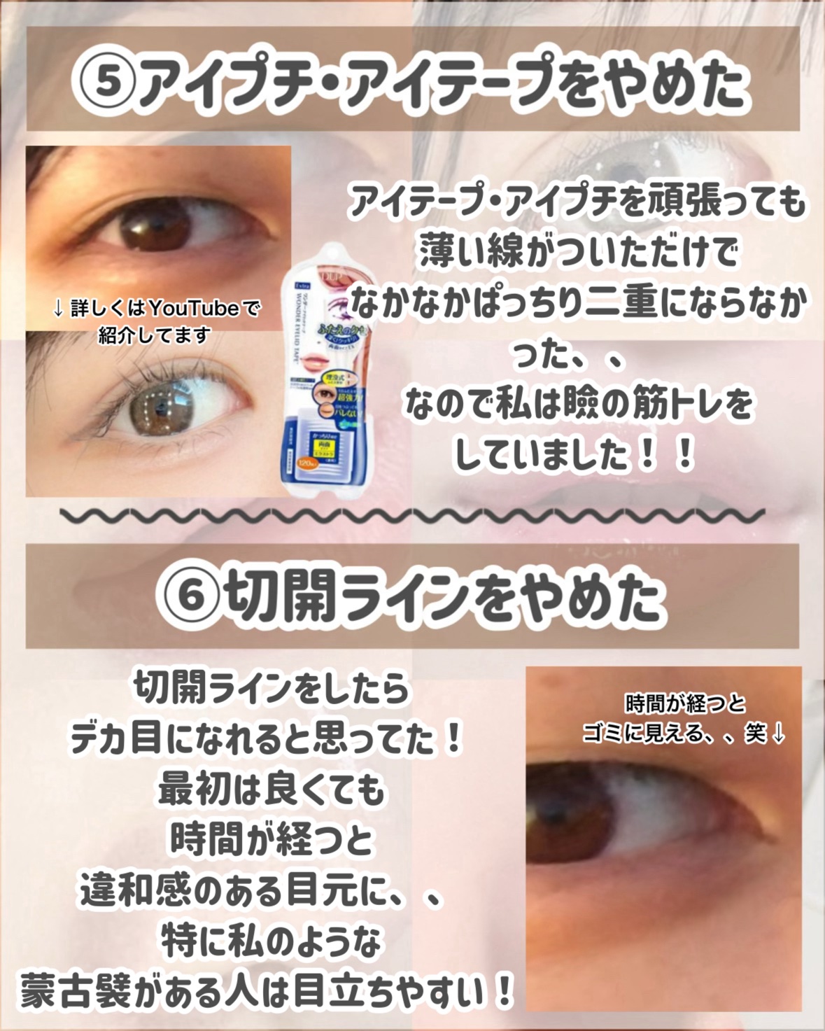 【瞼の筋トレ】について詳しく解説!!これさえすれば絶対変われます!!!瞼の筋トレって?という方は、画像をご覧下さい‼️これがないと私は今頃二重になってなかった…と言っても過言ではないくらい、私の癖付けには欠かせなかったものです!!今回は、昔からしている筋トレ1つと、最近思いついて実践している筋トレ2つをご紹介します!!どれもすごく簡単なので、ぜひ試してみてください📷Q 一日どのくらいしてた?A とにかく暇さえあればしていました!!1日30分の日もあれば、何時間もする日もありましたこの筋トレは、お風呂に入りながらや勉強しながら、スマホ見ながらでもできるのがいいところなので、スキマ時間を上手く活用するのがいいかな思います💭Q 今まで何回くらい筋肉痛になった?A 左右どちらも5回くらいだと思います!瞼が私より軽い方は、1、2回で十分スッキリすると思いますよ❣️Q どれくらいで筋肉痛になった?A 筋肉痛までは平均して2週間くらいかかりました!でもフォロワーさんの中には1日でなられた方も多くいらっしゃいますなのでその人の瞼や頑張り次第だと思います❣️Q 筋トレ1