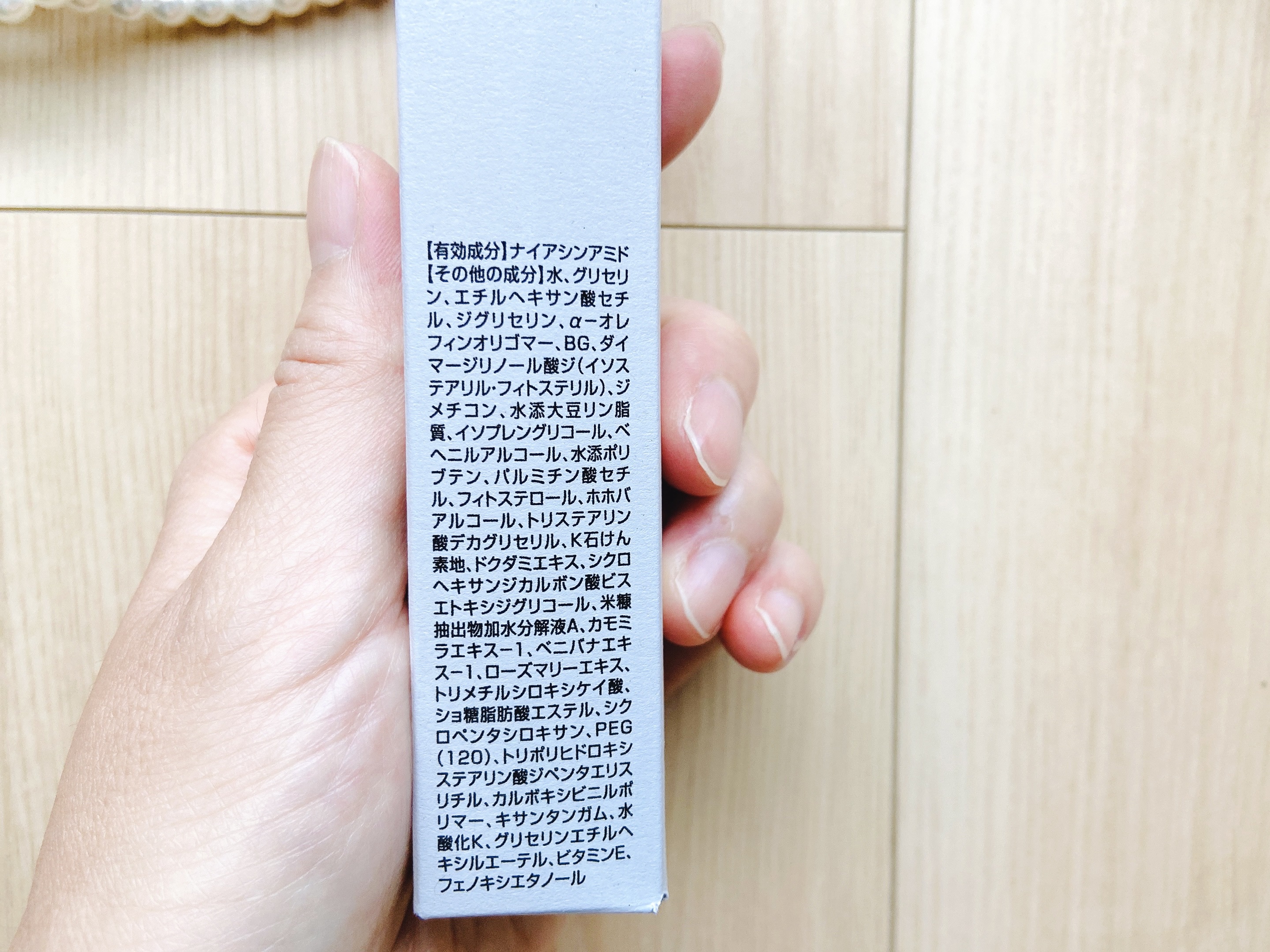 - <通常サイズ30g> 有効成分 ナイアシンアミド その他の成分 水、グリセリン、エチルヘキサン酸セチル、ジグリセリン、α-オレフィンオリゴマー、BG、ダイマージリノール酸ジ(イソステアリル・フィトステリル)、ジメチコン、水添大豆リン脂質、イソプレングリコール、ベヘニルアルコール、水添ポリブテン、パルミチン酸セチル、フィトステロール、ホホバアルコール、トリステアリン酸デカグリセリル、K石けん素地、ドクダミエキス、シクロヘキサンジカルボン酸ビスエトキシジグリコール、米糠抽出物加水分解液A、カモミラエキス-1、ベニバナエキス-1、ローズマリーエキス、トリメチルシロキシケイ酸、ショ糖脂肪酸エステル、シクロペンタシロキサン、PEG(120)、トリポリヒドロキシステアリン酸ジペンタエリスリチル、カルボキシビニルポリマー、キサンタンガム、水酸化K、グリセリンエチルヘキシルエーテル、ビタミンE、フェノキシエタノール <ラージサイズ60g> 有効成分 ナイアシンアミド その他の成分 水、グリセリン、エチルヘキサン酸セチル、ジグリセリン、α-オレフィンオリゴマー、BG、ダイマージリノール酸ジ(イソステアリル・フィトステリル)、ジメチコン、水添大豆リン脂質、イソプレングリコール、ベヘニルアルコール、水添ポリブテン、パルミチン酸セチル、フィトステロール、ホホバアルコール、トリステアリン酸デカグリセリル、K石けん素地、ドクダミエキス、シクロヘキサンジカルボン酸ビスエトキシジグリコール、米糠抽出物加水分解液A、カモミラエキス-1、ベニバナエキス-1、ローズマリーエキス、トリメチルシロキシケイ酸、ショ糖脂肪酸エステル、シクロペンタシロキサン、PEG(120)、トリポリヒドロキシステアリン酸ジペンタエリスリチル、カルボキシビニルポリマー、キサンタンガム、水酸化K、グリセリンエチルヘキシルエーテル、ビタミンE、フェノキシエタノール