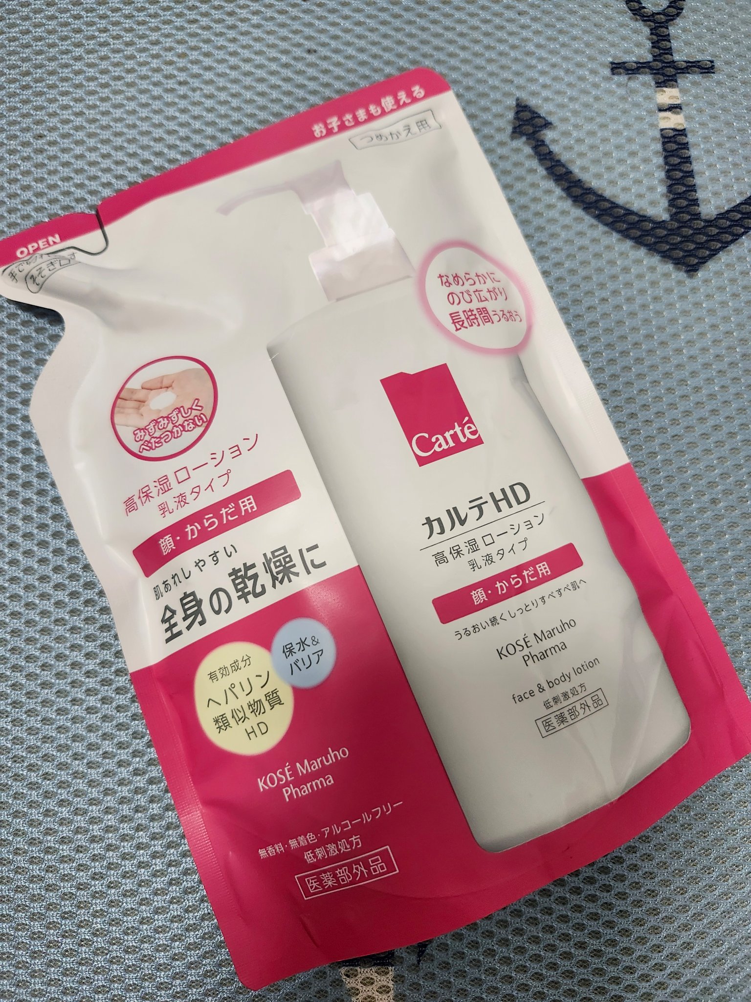 - 【高保湿フェイス&ボディローション】 顔にもからだにも。しっとりやわらか肌つづく。 信頼の保水有効成分「ヘパリン類似物質HD※」配合、低刺激処方の高機能フェイス&ボディローションです。 ヘパリン類似物質HDが、気温・湿度の変化で乾燥しやすいからだの肌のうるおい構造(角層ラメラ)を立て直し、しっとりやわらか肌に導きます。 2種のこだわりオイル配合で、しっとりするのにべたつかず、なめらかにのびひろがる使用感。敏感な肌でもまさつによるストレスがなく、全身をうるおいで満たします。 カルテHDシリーズとしては初めてお子さま(3歳以上)にもお使いいただける商品。 ・ボトルタイプ(220mL) ・ポンプタイプ(410mL) ・つめかえ用(370mL)の3種でラインアップ。 ご自身の保湿に、ご家族や大切なかたの保湿に。みずみずしくなめらかなうるおいが全身を包み込むフェイス&ボディローションです。 ※保水有効成分ヘパリン類似物質のこと <販売名:HD フェイスボディL>
