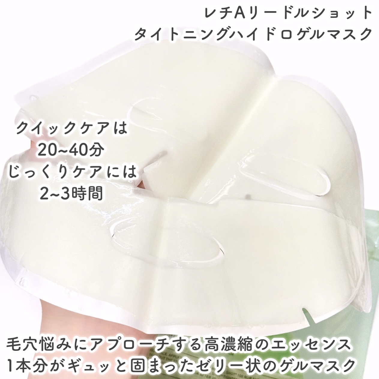 - 簡単2ステップで保湿&毛穴ケア*1ができる集中ナイトケア!レチA リードルショット100&タイトニングハイドロゲルマスクが毛穴悩み*2にアプローチする美容保湿成分を肌角層に浸透させます。エッセンスが1本分ギュッ!と固まったゼリー状になったゲルマスクは毎日変わる肌コンディションに合わせて使用時間を調節しながらケアできます! ■このような方へおすすめ 毛穴悩み*2をケアしキメ細かい美肌になりたい方 スキンケアの美容保湿成分を角質層まで浸透させたい方 おうちでエステ並の本格ケアを行いたい方 *1 うるおいを与えて毛穴を目立ちにくくすること *2 乾燥によって目立つ毛穴