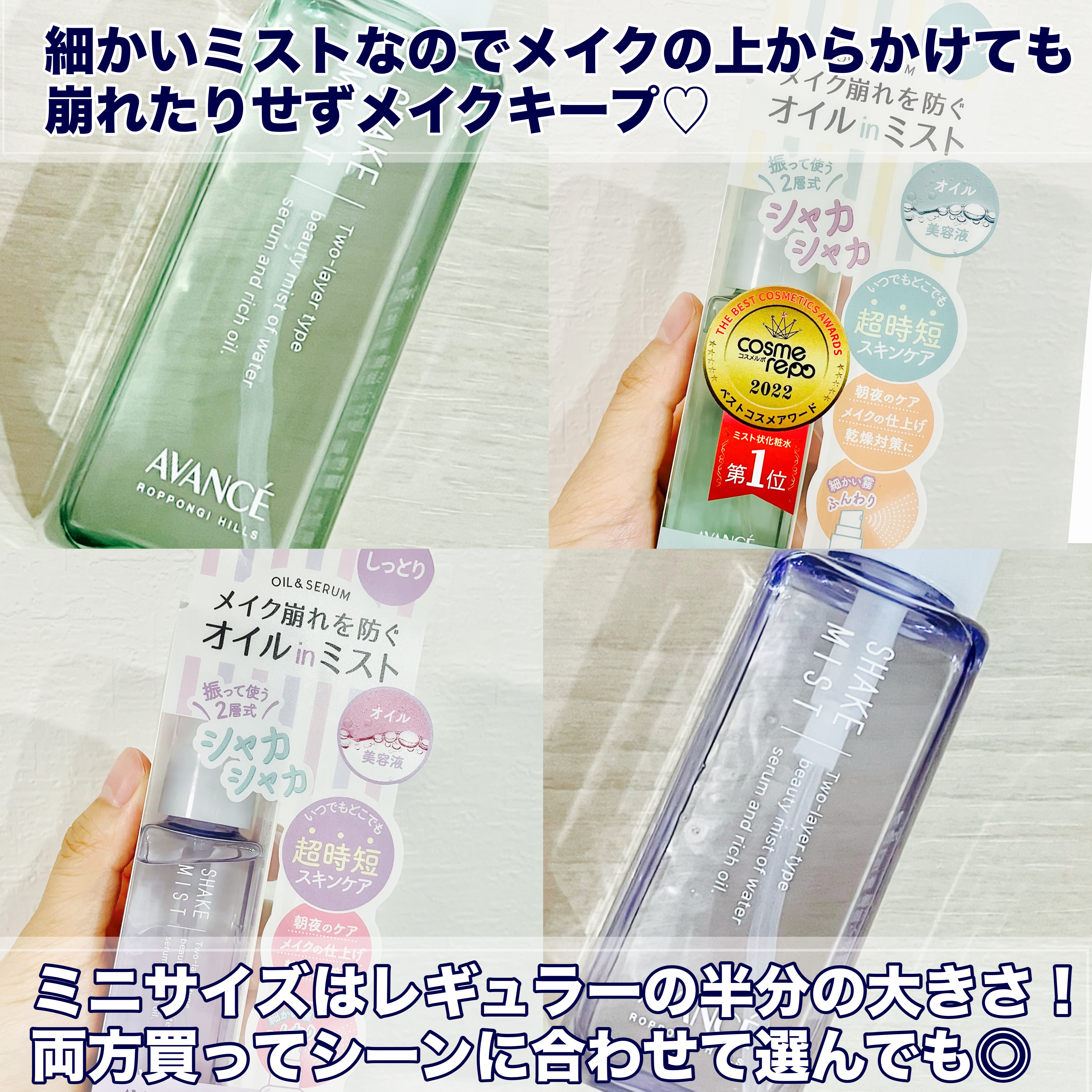 持ち運べるミニミスト👜˙✧˖°アヴァンセのシェイクミストは持ち運びもしやすいミニサイズも販売しています♡「さっぱり」と「しっとり」の2種類があるよ!さっぱりタイプは、肌を引き締めるウォーターセラムと、つややかな肌に導くオイルの2層タイプのオイ...