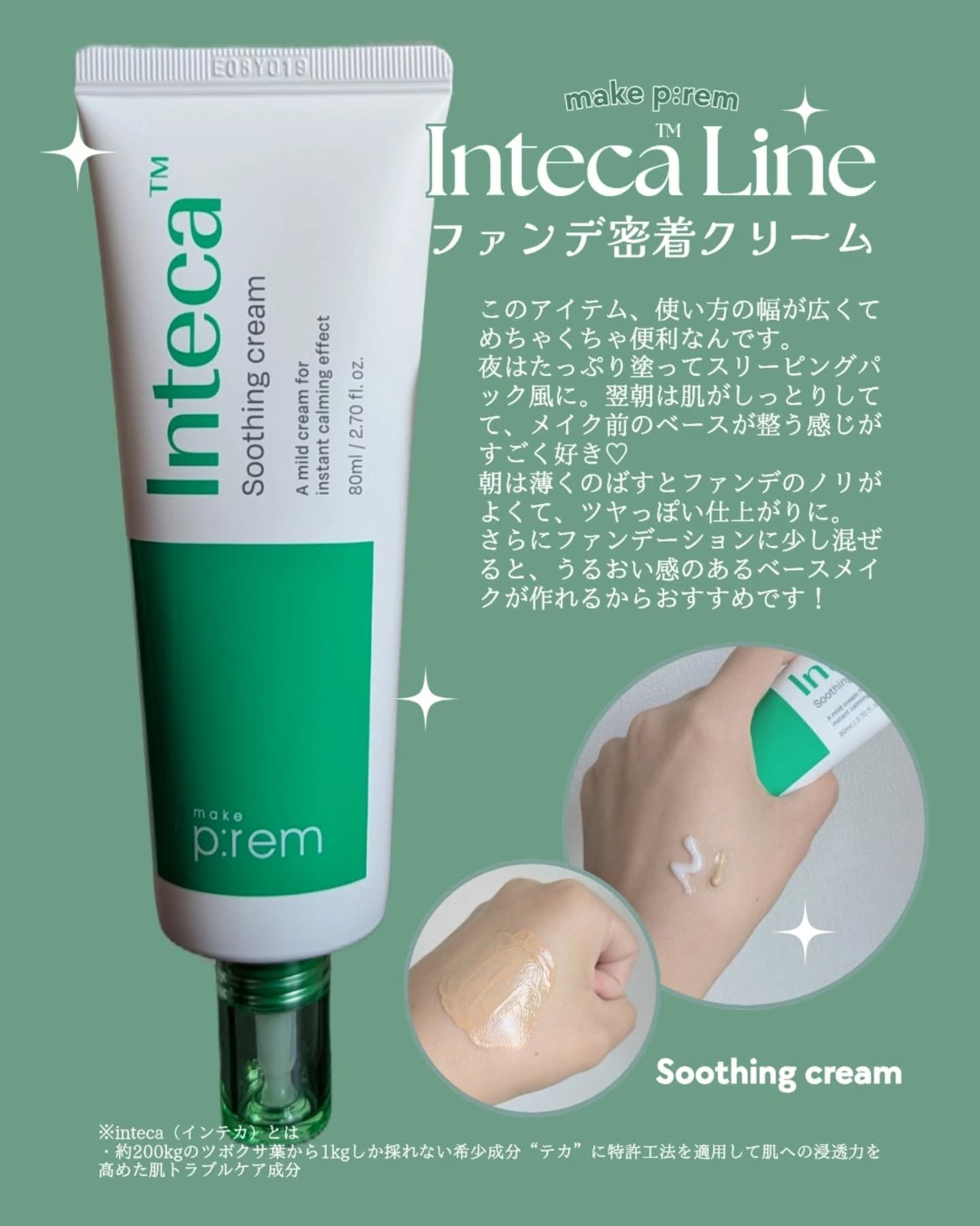 - 整肌効果を期待できるインテカスージングクリーム。独自製法をプラスして安定化したナノサイズのメイクプレムインテカ(INTECA)*を配合し、ツボクサの整肌成分を肌にたっぷりと浸透**させます。潤いたっぷりスージングテクスチャーで速やかに肌を整肌。 *整肌成分 **角質層まで 2025年10月11日(土)より全国のロフト*¹、PLAZA*¹、ハンズ*¹にて発売開始 *¹一部お取り扱いのない店舗がございます。