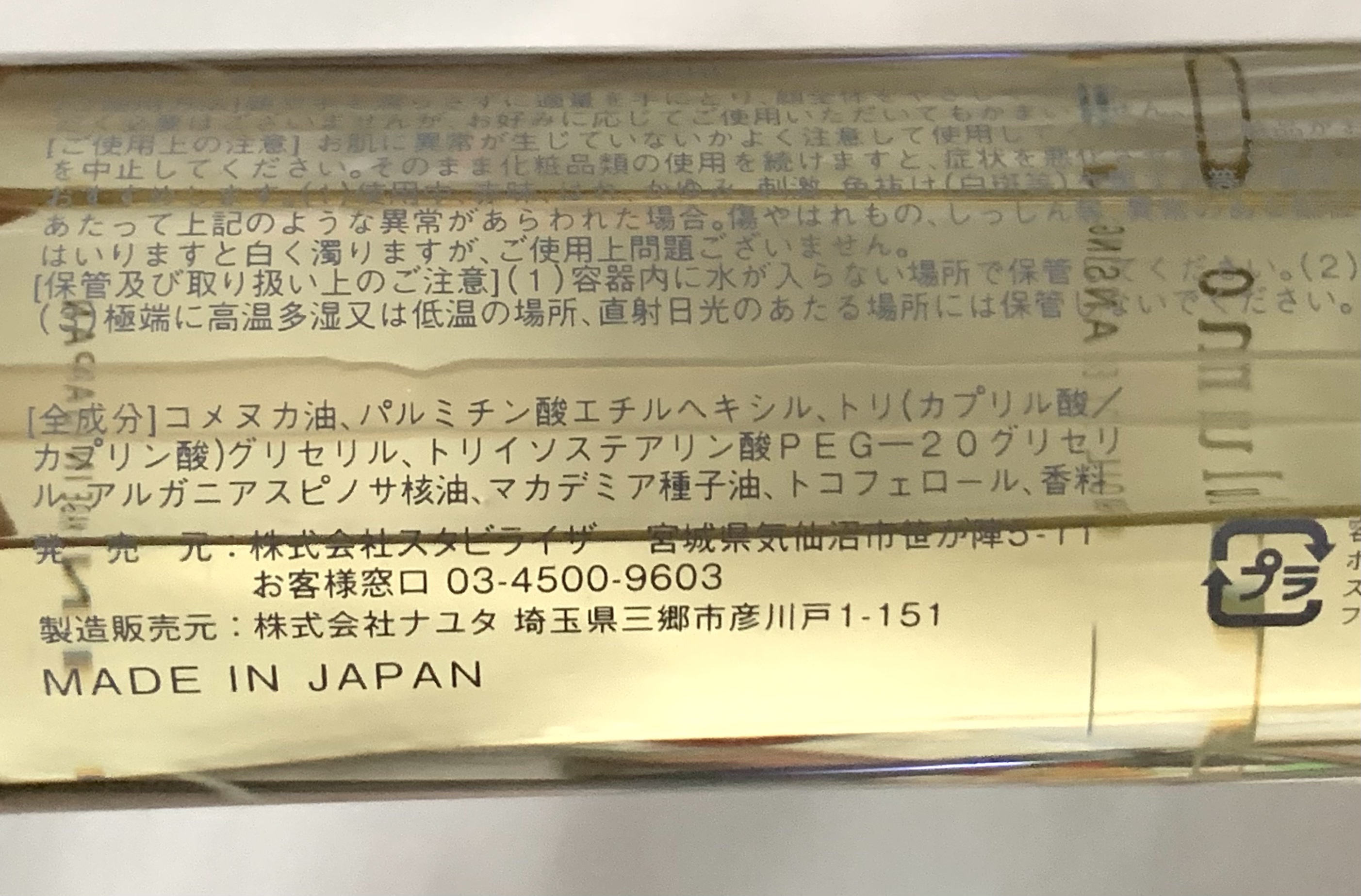 - コメヌカ油、パルミチン酸エチルヘキシル*、トリ(カプリル酸/カプリン酸)グリセリル*、トリイソステアリン酸PEG―20グリセリル**、アルガニアスピノサ核油、マカデミア種子油、トコフェロール、香料 *パーム由来 **なたね、パーム由来