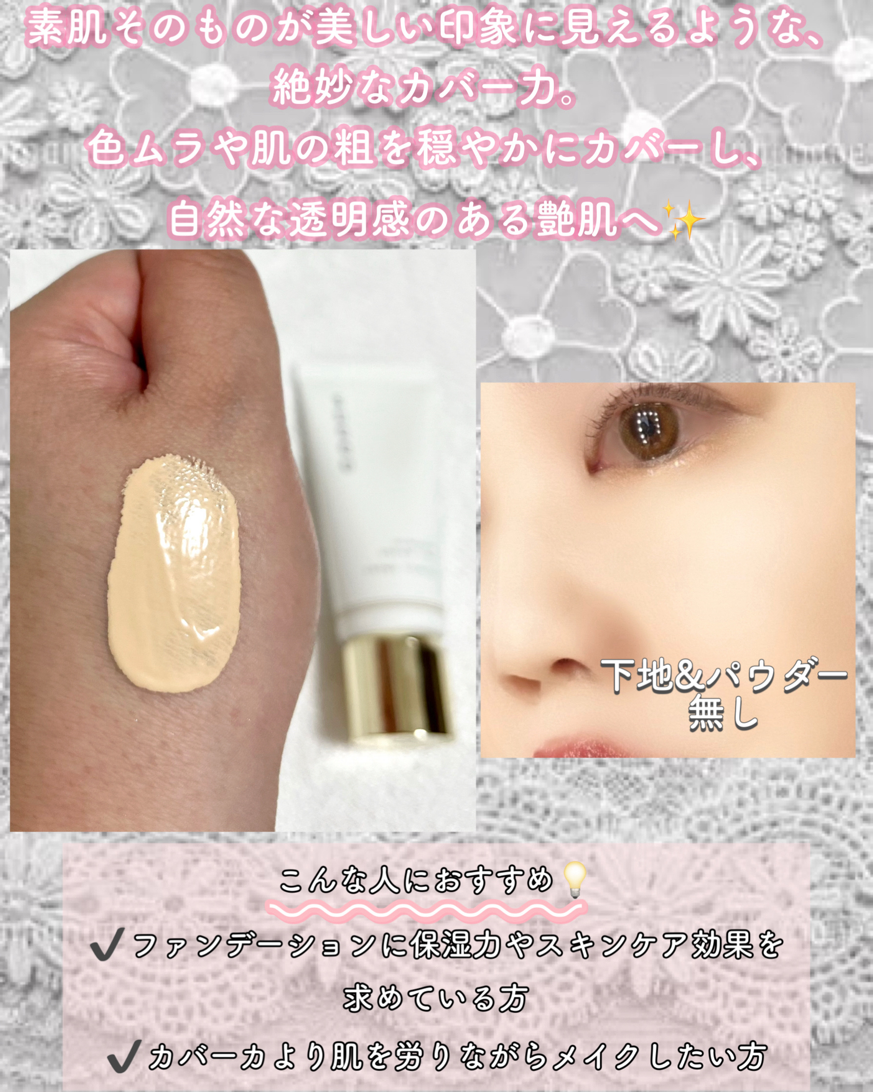 | ファンデーションランキング第46位 | スっと伸びの良いテクスチャーで肌にのせた瞬間の艶がとても綺麗!塗りたてはもちろんだけど時間が経った時の肌の状態がとっても綺麗でした♡ | 詳細を見る | |