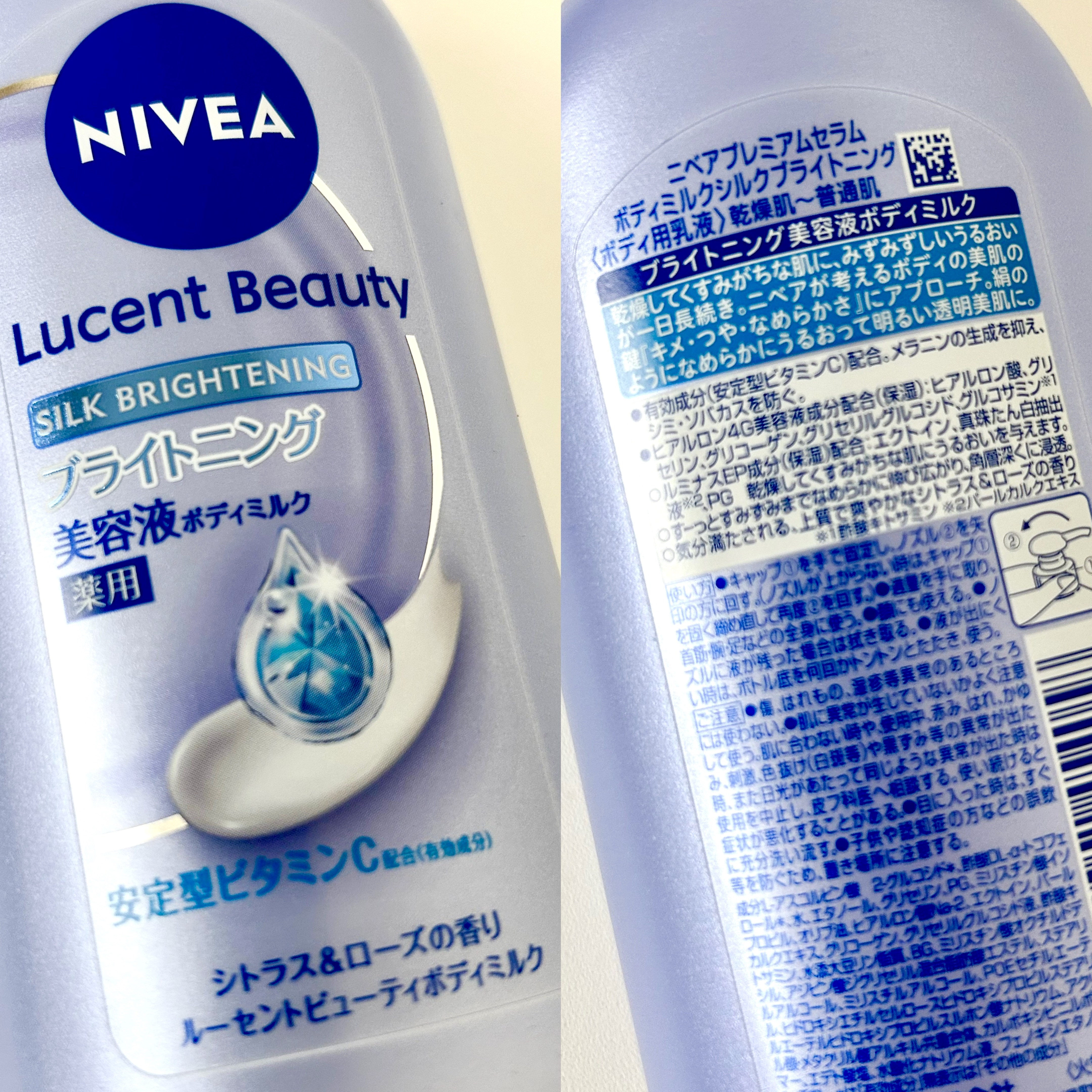 「ニベア」様から商品提供をいただきましたニベアルーセントビューティシルクブライトニングブライトニング美容液ボディミルクヒアルロン4G美容液成分*1配合(保湿)で絹のようになめらかにうるおい明るい印象の透明美肌に。伸びの良い緩めのテクスチャーの...