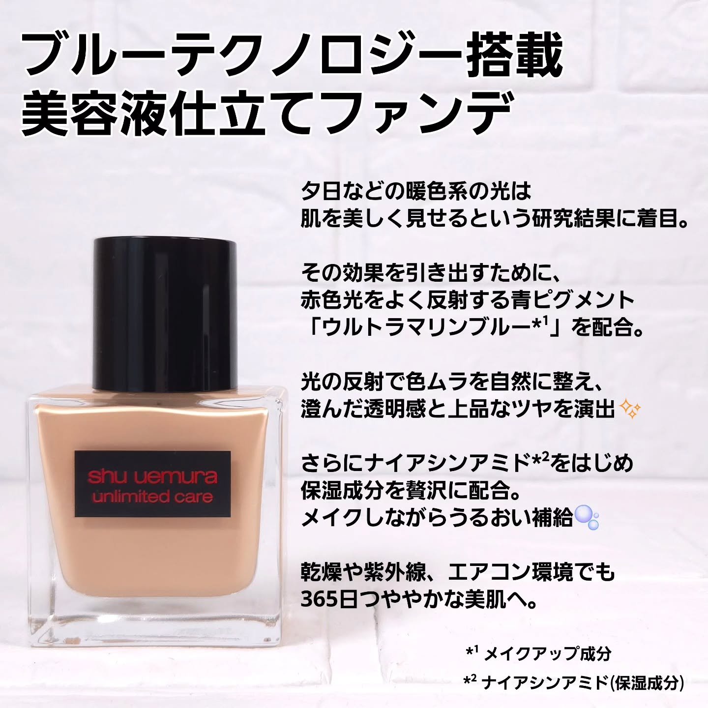 shuuemuraアンリミテッドケアツヤセラムファンデーションシュウウエムラの新作「アンリミテッドケアツヤセラムフアンデーション」は、ブランド史上最高レベルのスキンケア効果を搭載した美容液ファンデーション✨高配合の保湿成分・ナイアシンアミドを...