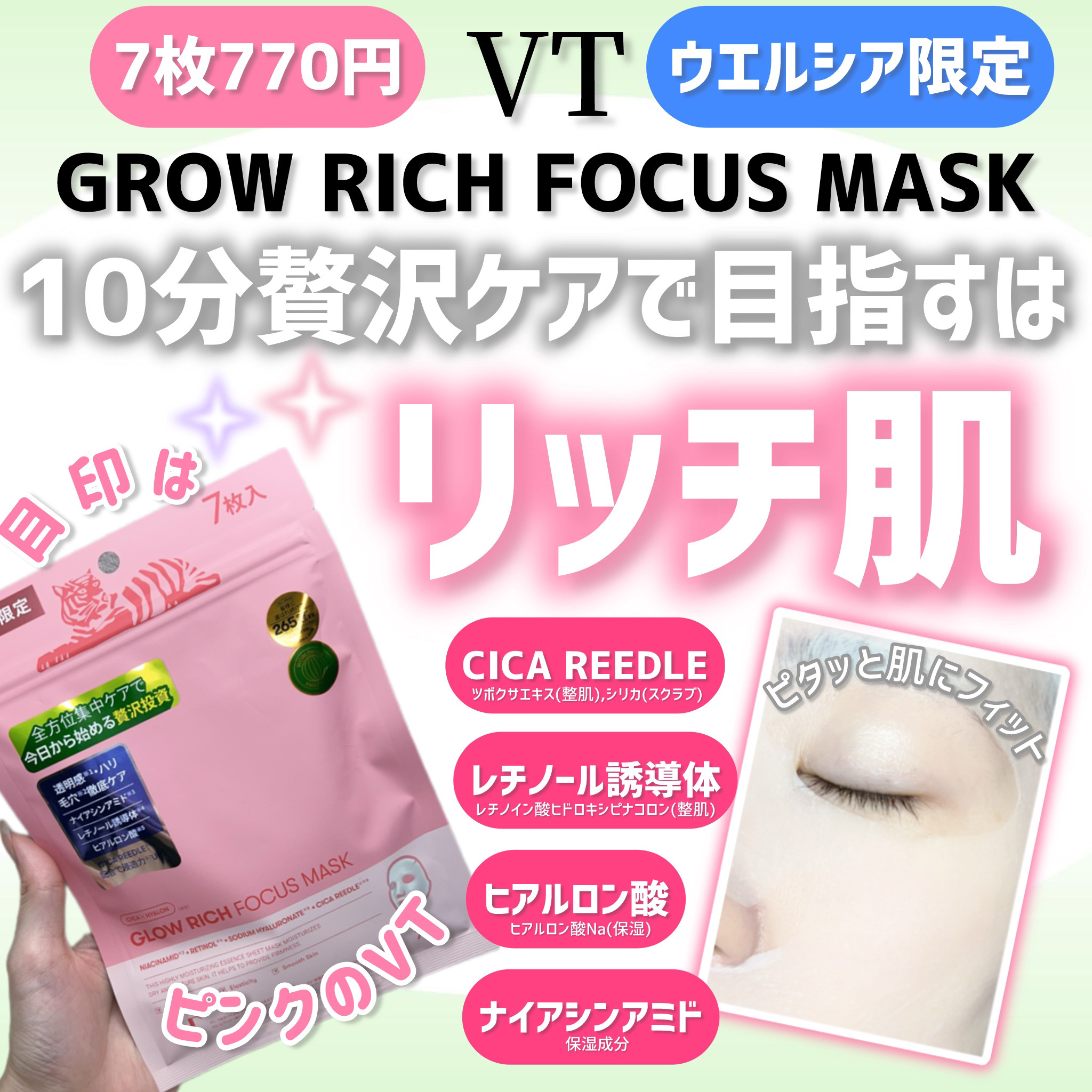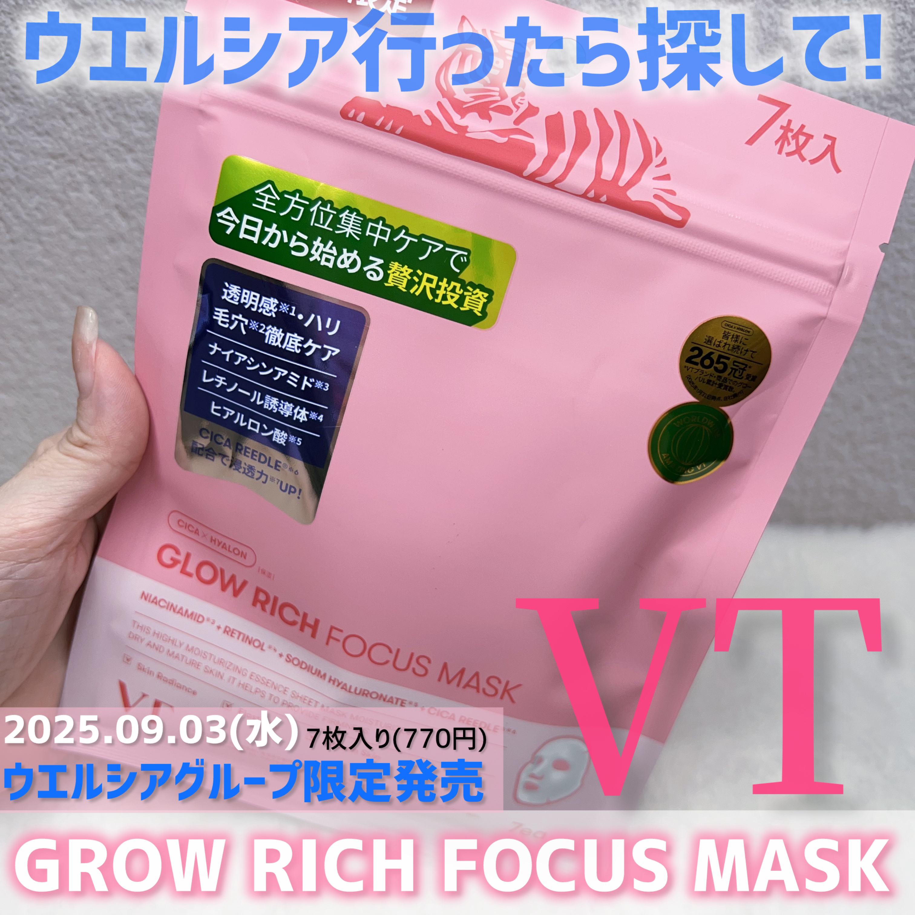 VT様からご提供いただきました!❄︎••••❄︎••••❄︎VTGROWRICHFOCUSMASK7枚入¥770❄︎••••❄︎••••❄︎9/3から全国のウエルシアグループ限定で店頭販売開始!※一部店舗取り扱いなし1枚で贅沢集中エイジングケ...