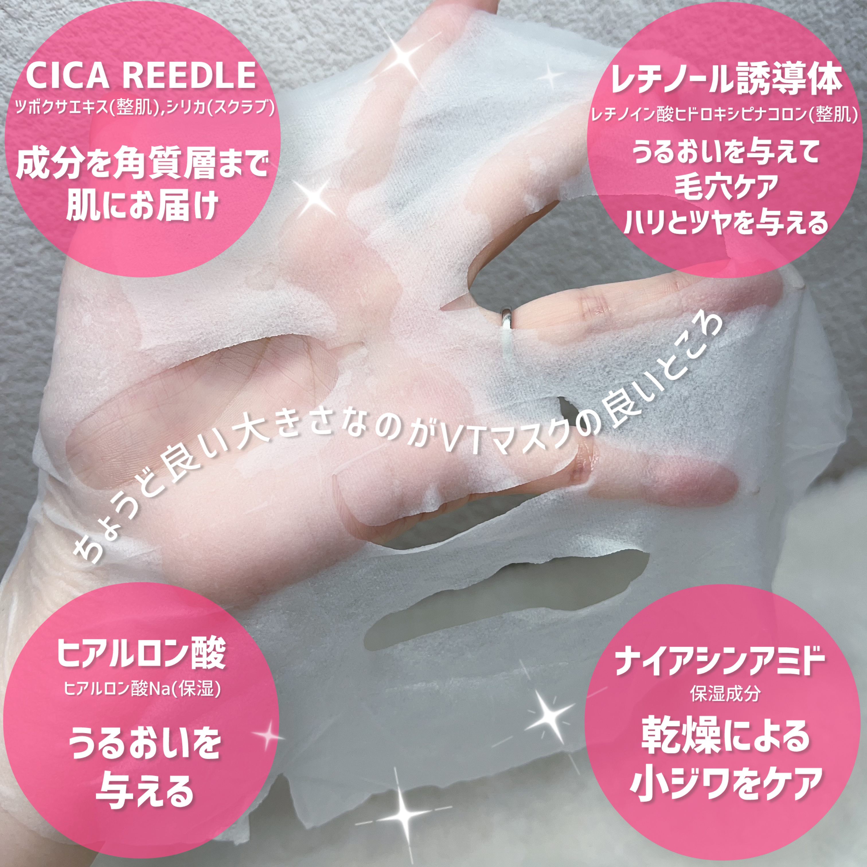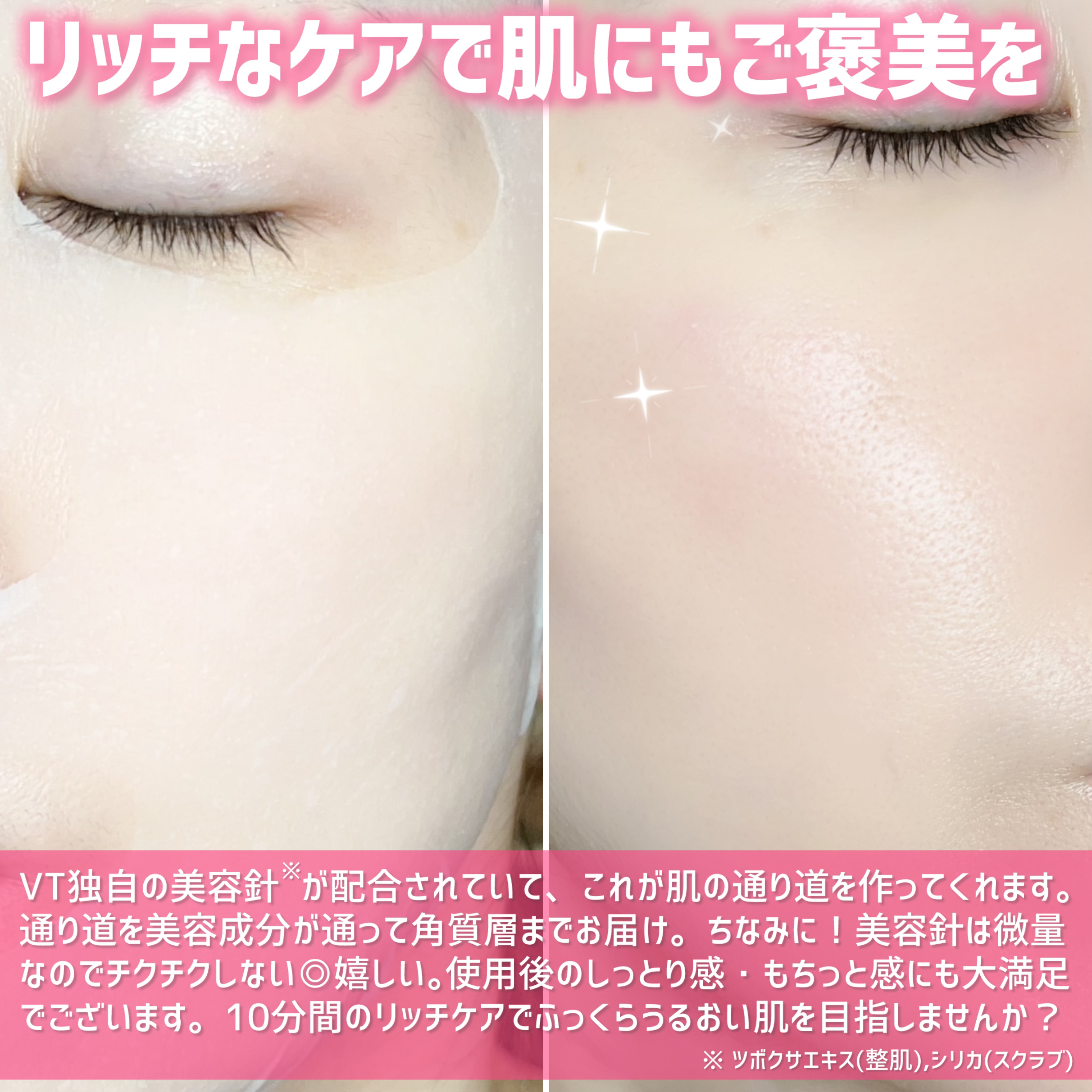 - 【ウエルシアグループ限定】 『GLOW RICH FOCUS MASK』は、エイジングケア※1に着目した集中ケア用シートマスク。10分のケア*で、透明感※2・毛穴ケア※2・ハリ・ツヤを同時に叶え、リッチな肌印象へ導きます。 主要成分: ナイアシンアミド※3 レチノール誘導体(レチノイン酸ヒドロキシピナコロン)※4 ヒアルロン酸※5 CICA REEDLE®※6 美容液成分が角質層まで浸透し、贅沢なリッチ肌ケアを実現。 10分*の集中ケアが新しい自分をつくる。VTのグロウリッチフォーカスマスクで贅沢な肌時間を。 ※1 年齢に応じた手入れ(エイジングケア) ※2 うるおいによる ※3 保湿成分 ※4 レチノイン酸ヒドロキシピナコロン(整肌) ※5 ヒアルロン酸Na(保湿) ※6 ツボクサエキス(整肌)、シリカ(スクラブ) *使用時間の目安