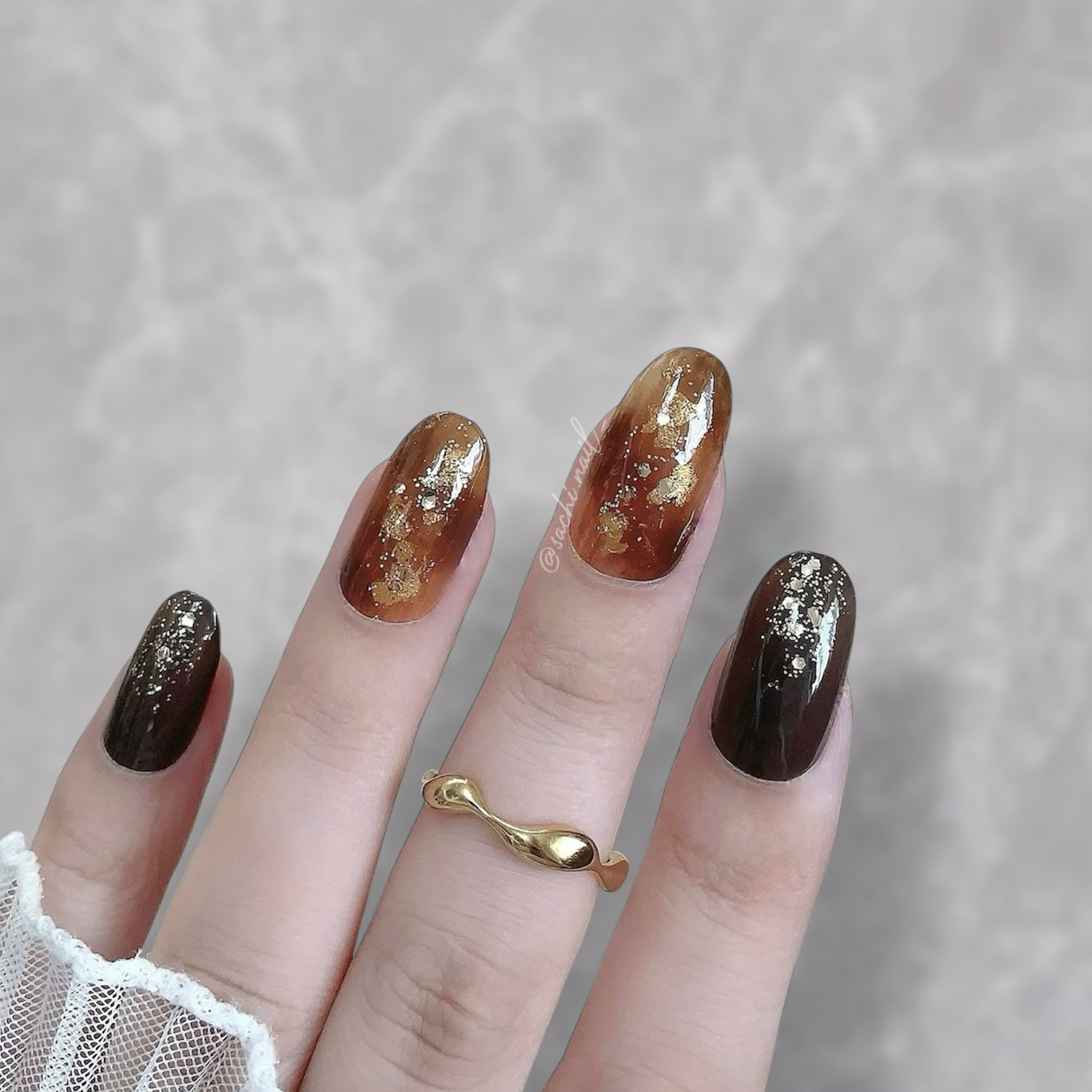 ワンカラーでも指ごとに色を変えるだけでオシャレに見えます💕 画像のようにゴールドラインとストーンを少し足すだけで華やかさがアップ🥰 何度かご紹介したことのあるスポンジで作るグラデーションです✨ スポンジを使うことで境目が綺麗に馴染んでくれます💕 アルミホイルの上でブラウンとトップコートを1:1くらいで混ぜたものを、トップコートのハケに取って3箇所に塗るだけ👌 事前に混ぜたものを塗ることで、爪の上でぼかすより簡単に出来ます💕 ベースカラーが乾く前に点置きしてぼかすことで綺麗にぼかせます✨ スピードが大事なので、使うポリッシュのキャップは全て開けておきましょう😊 天然石のラインはガタガタの方がより天然石っぽく見えるので、ラインを描くのが苦手な方でも大丈夫🙆♀️ 難しそうに見えて、やってみると意外と簡単に出来ます♡