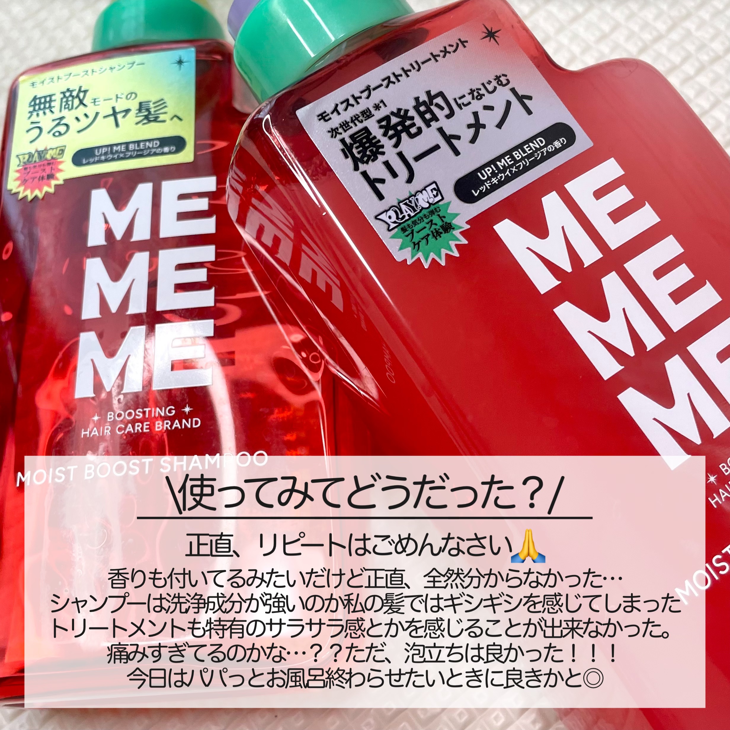 MEMEMEモイストブーストシャンプーモイストブーストトリートメント⭐️毛先までぷるんと弾む、自信がみなぎるうるツヤ髪へシャンプーはすぐにモコモコ泡立ち、サッとすすげる!泡立ちも細かく洗い上がりも⚪︎トリートメントはすーっと馴染んでくれていろ...