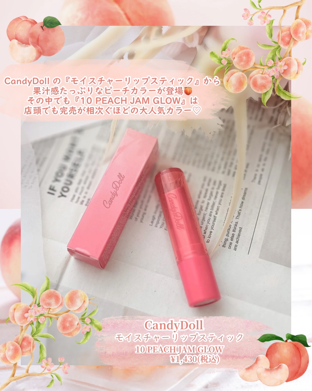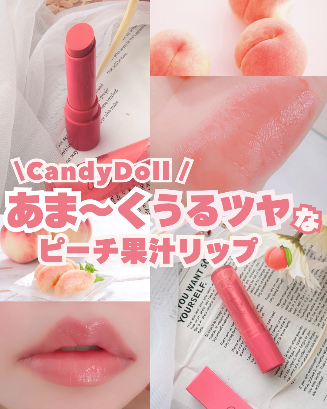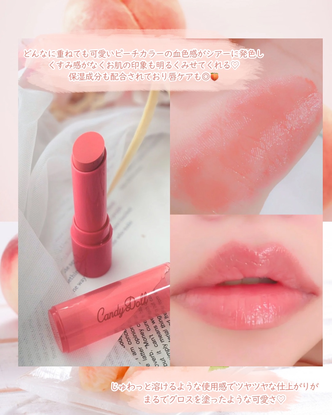 - 【数量限定】 \大人気リップから新シリーズが登場!/ 唇をケアしながらいつでも血色感のあるぷるむち唇を演出 #24時間盛れリップ*1 ♢リップクリームのような保湿感 ♢グロスのようなツヤ感 ♢シアーで透明感のあるカラー ♢いつでも手軽に血色感をプラス 欲しい機能をぎゅっと詰め込んだリップスティック シアー感・保湿力UP*2 誰でも盛れる粘膜系ピーチカラーで 桃果汁たっぷりジューシーな唇が叶う 『シアーピーチシリーズ』 【商品POINT】 ①透明感引き立てカラー 彩度・発色・透け感のバランスを調整した CandyDoll独自のこだわりカラー お肌の透明感を引き立て、顔全体をワントーン明るい印象に ②グロスのようなツヤ感 体温でとろける軽くてなめらかなテクスチャー ひと塗りでちゅるんとしたツヤ感をプラス ③保湿ケア処方 モモ葉エキス・モモ果汁エキス・モモ種子エキスなどの 15種類の美容保湿成分をたっぷり配合 うるおいで唇を包み込み、べたつかずにしっかり保湿ケア *1 効果の持続時間を保証するものではありません。24時間のどんなシチュエーションでもご使用いただけることを指しています。 *2 他シリーズとの比較
