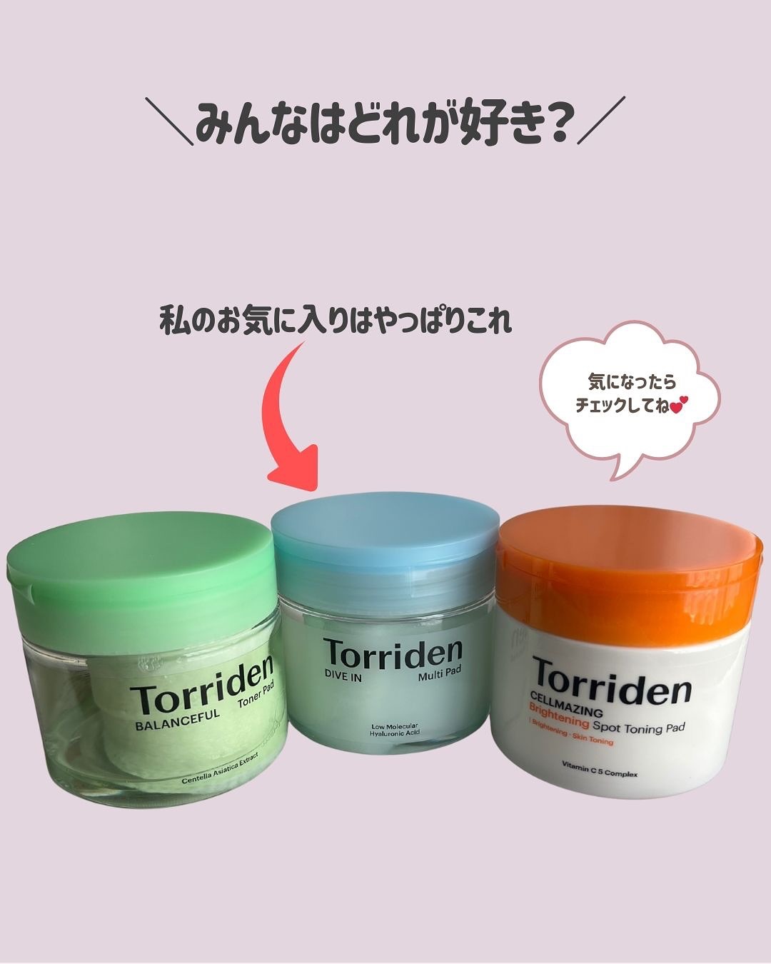 @torriden_jpTorriden💙ダイブインマルチパッド💚バランスフルシカトナーパッド🧡セルメイジングビタCブライトニングパッド(近日発売予定)水分、キメケア、くすみケア好きなパッドで悩み解決!肌の悩みに合わせて選べるトリデン...
