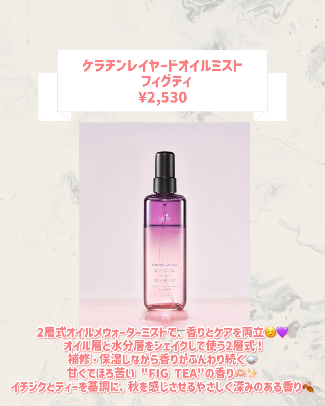 「La'dor」さまから商品提供していただきました♡\\香水のようなヘアミスト🫧//*La'dor*ケラチンレイヤードオイルミスト〔フィグティ〕ヘアパフュームとヘアケアを同時に叶える香水のようなヘアミスト🫧加水分解ケラチンが1,000pm配合...