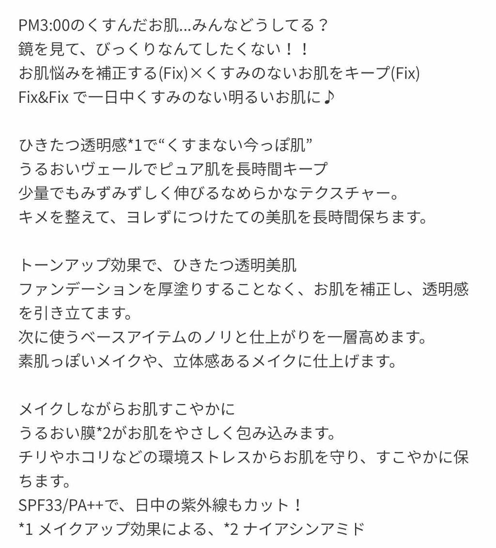 - トーンアップ効果で、ひきたつ透明美肌お肌悩みを補正する(Fix)×くすみのないお肌をキープ(Fix)する化粧下地。[SPF33/PA++] ◆ひきたつ透明感*1で“くすまない今っぽ肌” うるおいヴェールでピュア肌を長時間キープ 少量でもみずみずしく伸びるなめらかなテクスチャー。 キメを整えて、ヨレずにつけたての美肌を長時間保ちます。 ◆トーンアップ効果で、ひきたつ透明美肌 ファンデーションを厚塗りすることなく、お肌を補正し、透明感を引き立てます。 次に使うベースアイテムのノリと仕上がりを一層高めます。 素肌っぽいメイクや、立体感あるメイクに仕上げます。 ◆メイクしながらお肌すこやかに うるおい膜*2がお肌をやさしく包み込みます。 チリやホコリなどの環境ストレスからお肌を守り、すこやかに保ちます。 SPF33/PA++で、日中の紫外線もカット! *1 メイクアップ効果による、*2 ナイアシンアミド