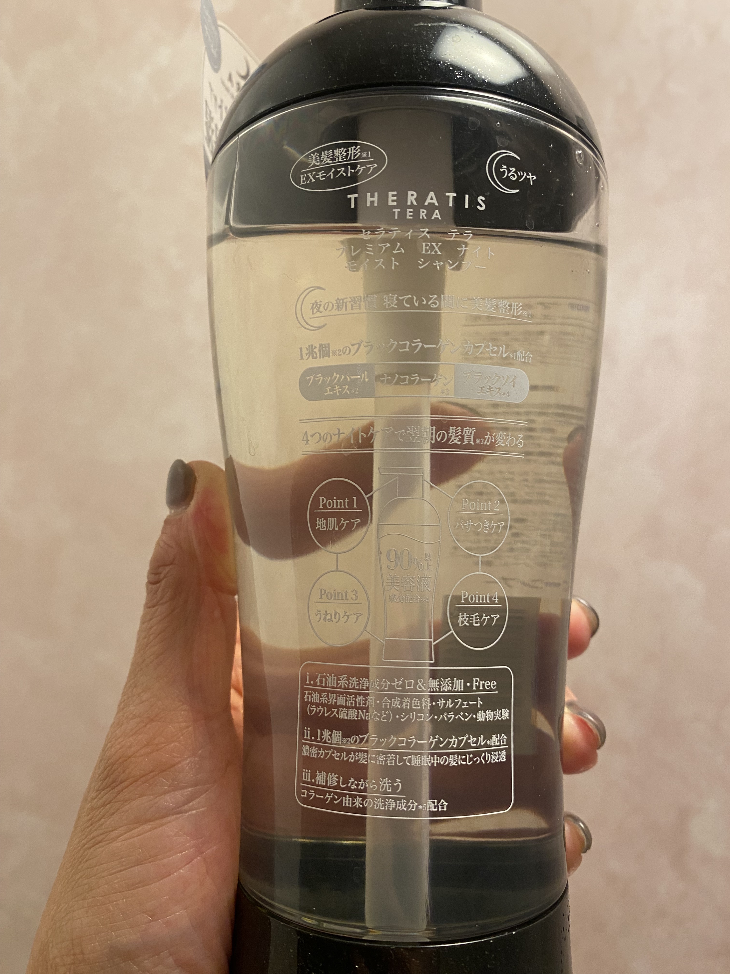 - 寝ている間に1兆個*1のブラックコラーゲン*2などの美容液成分がしみ込む最高峰*3ナイトケアシャンプー・ヘアトリートメント。 製品の90%以上を美容液成分*4で構成し、毛髪全般の乾燥悩み(地肌ケア・パサつき・ハリコシ・枝毛防止)にアプローチします。 贅沢な成分と最高峰*2処方でワンランク上*3のうるツヤ髪へ導きます。 石油系洗浄成分・合成着色料・ラウレス硫酸Na・パラベン・動物実験フリー処方。 シャンプー:ローズマリーアロマの香り ヘアトリートメント:ラベンダーアロマの香り *1製品に配合しているリポソーム成分(*2)の数量 *2加水分解コンキオリンタンパク、加水分解コラーゲン、加水分解ダイズエキス(全て保湿)をリポソーム化したもの *3当社既存品内(THERATISシリーズ内) *4基剤を除く、水を含む