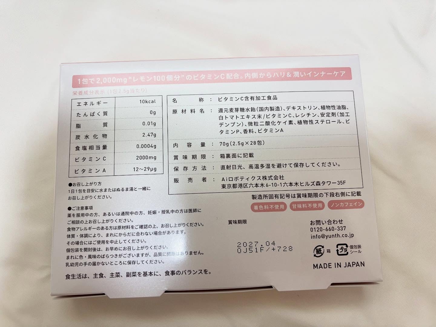 - ①レモン約100個分相当の高濃度ビタミンC、1本に2,000mg配合 ビタミンCは、体内でつくることができないため、毎日の補給が欠かせない栄養素です。インナーケアだけでなく、エイジングケア*1、そして日差しが気になる季節にも欠かせません。「Yunth リポソーム生ビタミンC」は、1本あたり2,000mg*2(レモン約100個分相当*2)の高濃度ビタミンCを贅沢に配合し、毎日の美しさと健やかさを力強くサポートします。 *1 年齢に応じたケア *2 リポソームビタミンC1,000mgとして ②高吸収型「リポソーム生ビタミンC」×即攻型「生ビタミンC」を配合 ビタミンCは大量に摂取しても体外に排出されやすいという特性があります。 Yunthではゆっくり届く[高吸収型]リポソーム生ビタミンCと、素早く広がる[即攻*型]の生ビタミンCを1000㎎ずつ配合し、常に必要な量を体内に巡らせられる設計に。 * 溶ける速さのこと ③レチノール&ホワイトトマトで美容の贅沢ケア 生ビタミンCに加え、レチノール(ビタミンA)や、無色カロテノイドが豊富に含まれているホワイトトマトエキスを厳選配合。 ビタミンCと一緒に摂りたいレチノールと同時に摂取することで相性がよいと言われており、ホワイトトマトは、日差しの強い季節に取り入れたい成分として注目されています。 内側から美容ケアをサポートし、エイジングケア*にもアプローチします。 * 年齢に応じたケア ④人工甘味料など無添加でも、飲みやすく・続けやすい 毎日口にするものだから、余計なものは入れていません。 人工甘味料、合成香料、合成着色料は一切不使用。 レモンのビタミンCをそのままに、クセになるすっぱさです。 さっと溶けて飲みやすく毎日続けられるよう、超微細なパウダータイプです。 ※公式サイト、ECモール(Amazon、楽天など)で発売中
