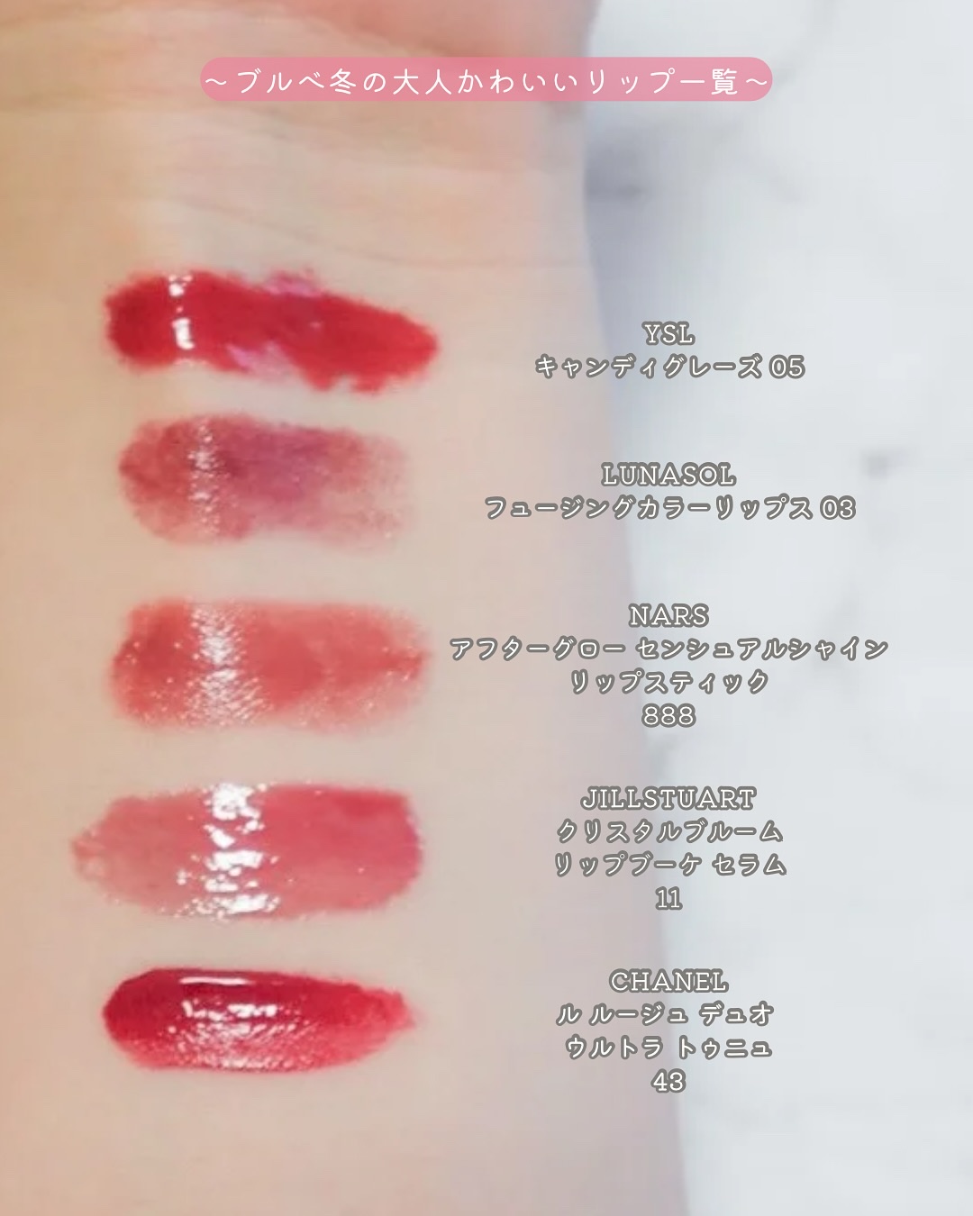 .ブルベこれ買って!最新の秋リップおすすめ10選❄️🩷【前編デパコス4選】..今年の秋に発売された最新のコスメの中でサロンに入荷したブルベにおすすめのリップを集めました😆💗(アイシャドウなどは既に別投稿でまとめているので是非📝).どれも全部可...