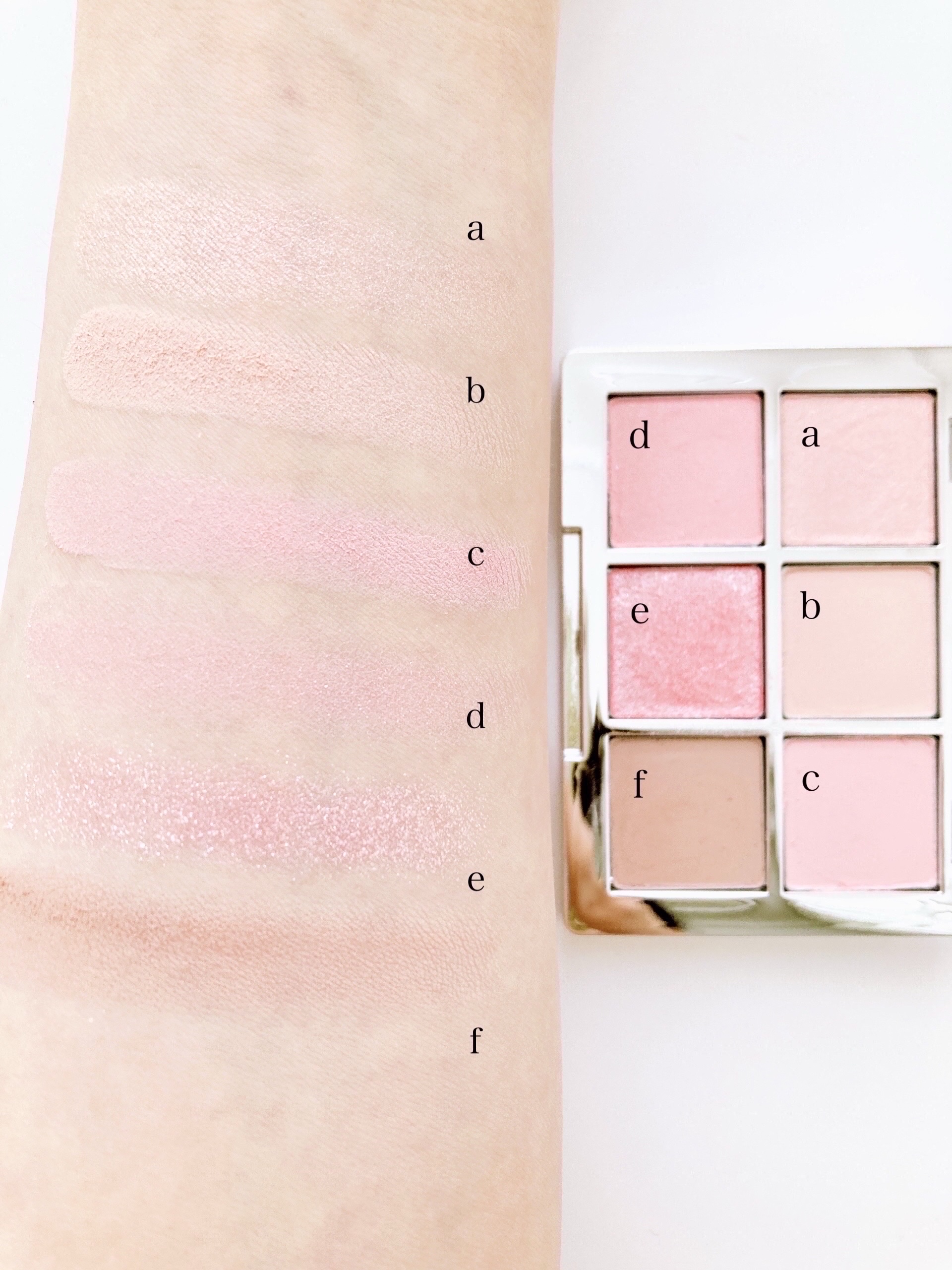 抜け感のある上品なピンクグレージュというだけあって、全て淡い色でキレイなくすみピンク 左上のキラキララメのみ透け感がありますが、こちらのラメもギラギラした感じではなく上品なキラキラで 普段使いにはさりげなく おでかけには涙袋にしっかり入れても可愛いと思いました 全体的に淡くて優しい発色ですが、重ねるとしっかりグラデーションができます それぞれの色が優しい色味なので、単色使いや部分使い、他のアイシャドウとの組み合わせなど 色んな使い方ができそうです!