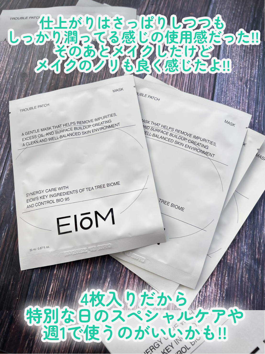 EIOMトラブルケアパッチマスク汗や角質により詰まった毛穴汚れをケア95億個もの乳酸菌由来成分*肌を整え、健やかな肌へティーツリーバイオームなど配合*生菌ではなく、乳酸菌由来の死体です。シートがピタッとしていて若干匂いがするかな?くらい50〜...