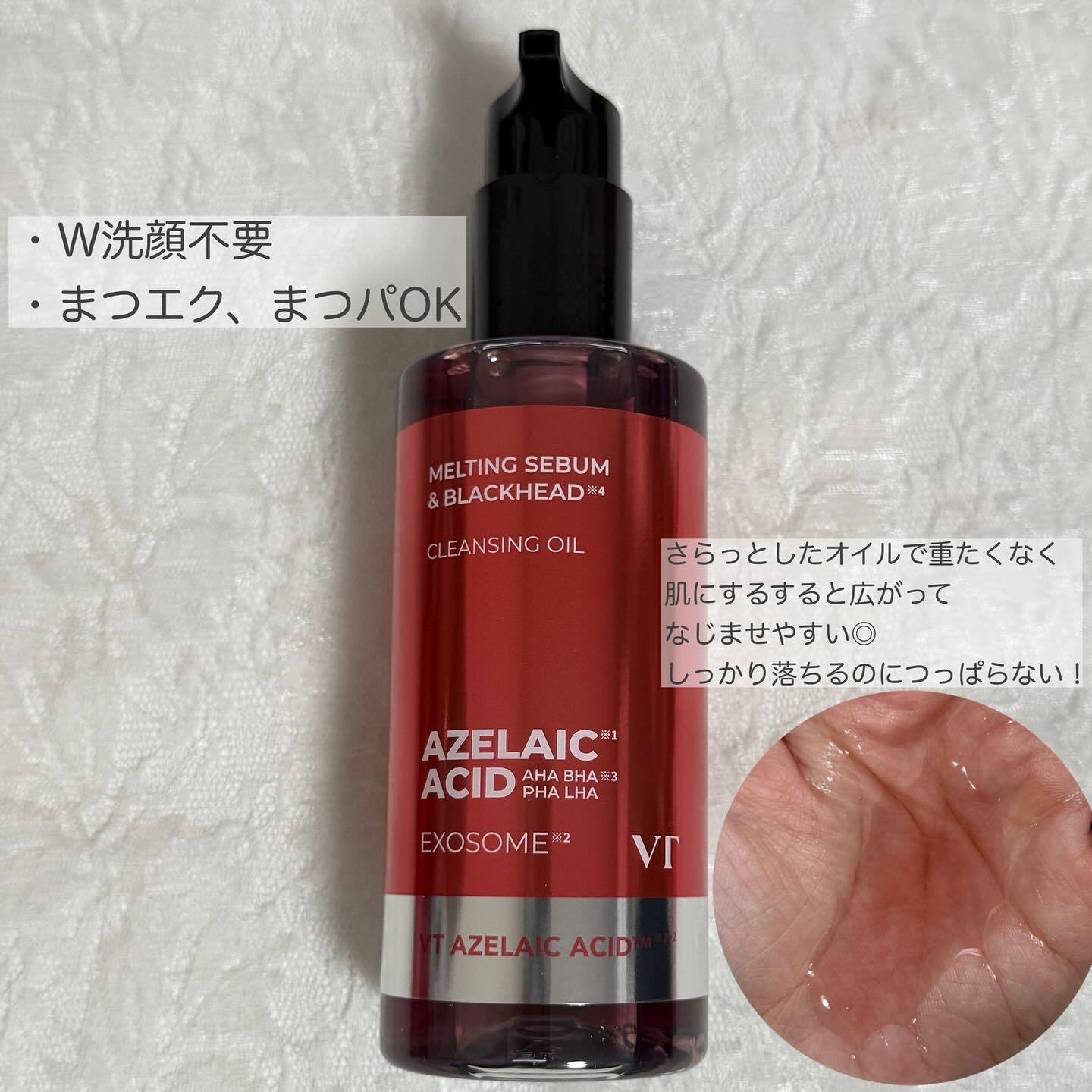 - 最近話題の毛穴ケア・整肌成分アゼライン酸!VTからはクレンジングオイルが登場! ポイントメイクまで落とすしっかりした洗浄力で、毛穴・皮脂までケアし保湿まで叶える一石三鳥アゼライン酸クレンジングオイル。 19種の植物性オイル*1も配合で、目に見えるブラッドヘッド*2から、隠れているホワイトヘッド*2、皮脂まですっきりケアします! ダブル洗顔不要! ※パッケージリニューアル ■このような方へおすすめ メイク・毛穴までディープクレンジング求める方 クレンジングでスキンケアまで行いたい方 ツッパリ感の少ないクレンジングを探していた方 ブラックヘッド*ケアも行いたい方 *1ダイズ油、アルガニアスピノサ核油、ユズ果実油、コメヌカ油、オタネニンジン種子油、アーモンド油、ザクロ種子油、リンゴ種子油、ホホバ種子油、ツバキ種子油、、バオバブ種子油、ユチャ種子油、ベニバナ種子油、ヒマワリ種子油、ヒポファエラムノイデス油、オリーブ果実油、アボカド油、アンズ核油、クロフサスグリ種子油(いずれも保湿) *2古い角質による