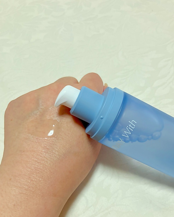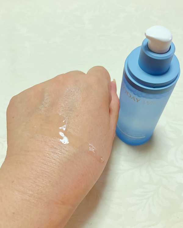 トゥデイウィズソフトモイスチャーカーミングアンプルを使ってみました。水色の爽やかなボトルに入っています。透明のフタを外すとポンプ式の容器になっていますよ。出しやすいです。透明で少しとろみがあるテクスチャーです。伸びは良くてしっとりします。鎮静...