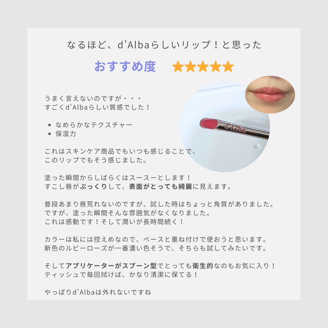 【PR】d'Albaさまからいただきました✨️ずっと気になってた商品でめちゃくちゃ嬉しい🥺ツヤ感とボリューム感が天才級にかわいいです👍特に03のカラーがブルベカラーでお気に入り😍#ダルバ#ダルバリップ#ボリューマイザー#プランパー...