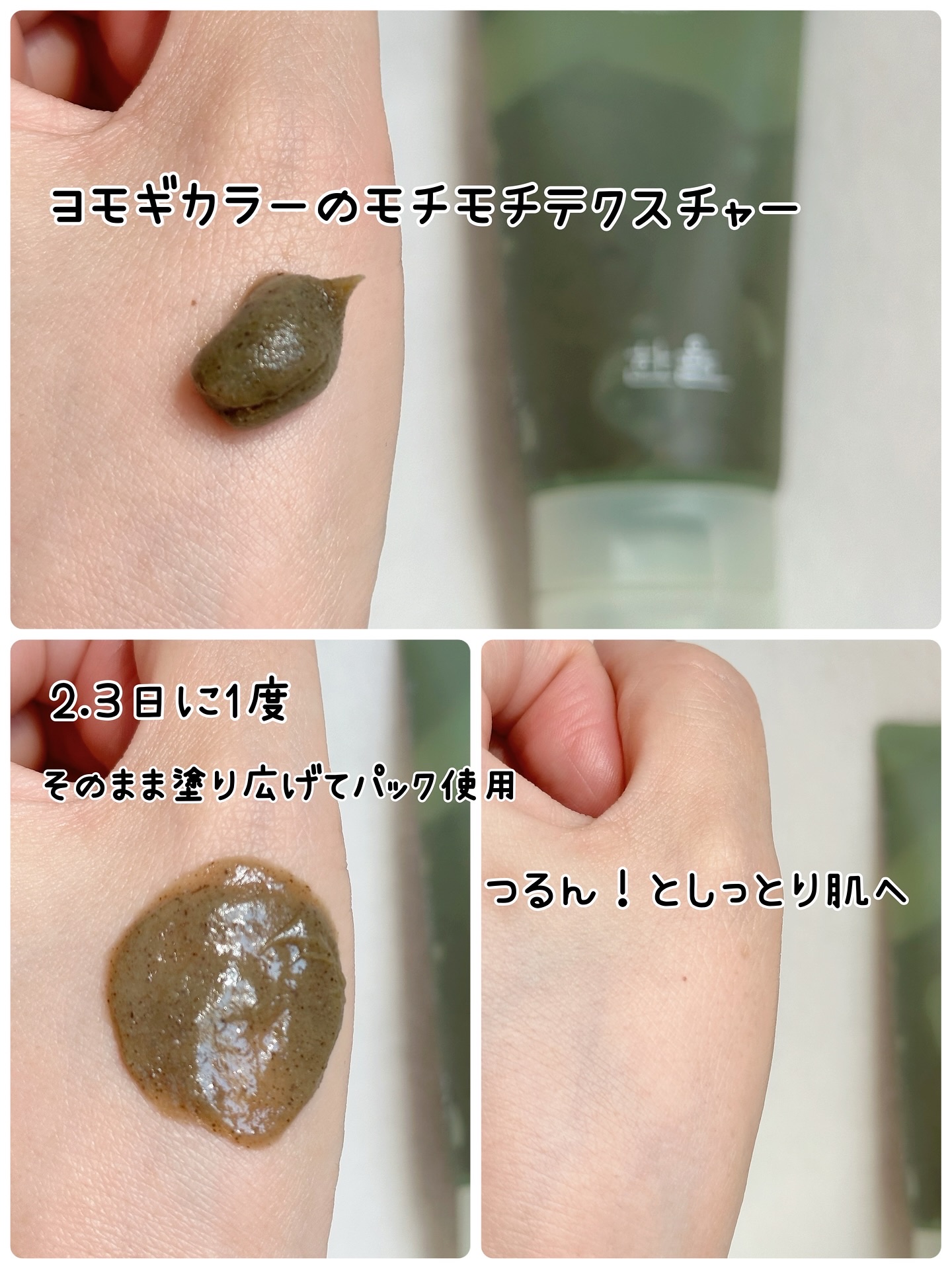 - ヨモギ餅のようにもっちりとしたテクスチャーの吸着クレンジング。パックからフォームに変わり、皮脂や毛穴、角質にアプローチしてしっとりスッキリと洗い流します。