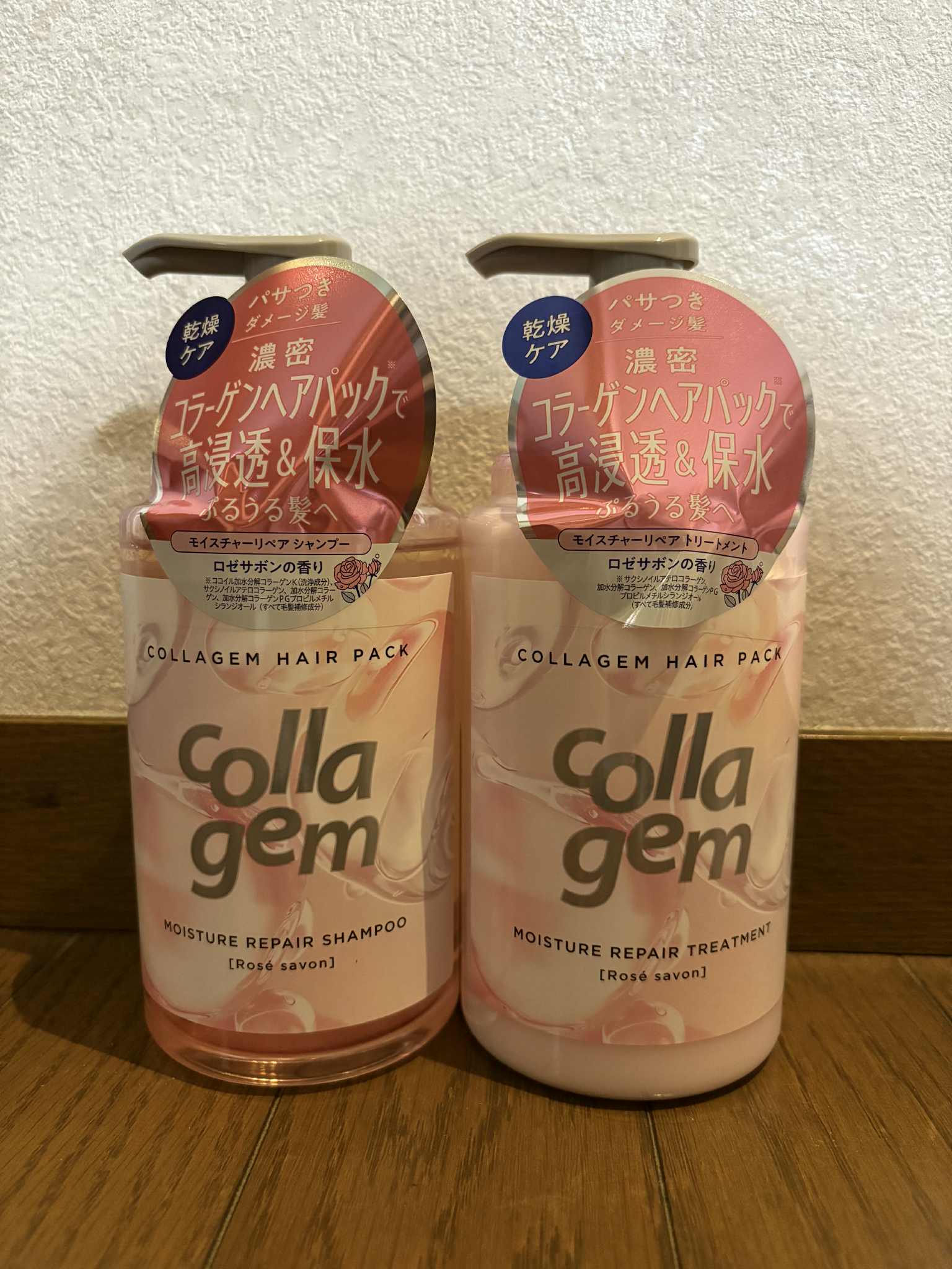 - 洗うだけで、濃密コラーゲンヘアパック※1,4,5,6 「コラジェム モイスチャーリペアシャンプー&トリートメント」 コラーゲン由来の洗浄成分※1配合(※シャンプーのみ) 乾燥・パサつく髪に【高浸透&保水】 まとまる、ぷるうる髪へ ◎リッチハイドレーション処方 【髪内部の崩れた保水の構造※2を補修】 パサついて硬くなった髪をなめらかに ➀スクワラン※3 髪内部に浸透し、潤いとしなやかさを与える ➁モイスチャーオイル※4 髪を補修・保護し、なめらかな手触りに 【コラーゲン美容補修成分※5,6】 ➀デュアルリペアコラーゲン※5 大きさが違う2つのコラーゲンが 内部と外部から潤い浸透、洗うたび補修 ➁ヒートケアコラーゲンMIX※6,7 熱を味方にしてアイロンなどの熱ダメージから キューティクルを補修・保護 「ほんのり甘く透明感のある ロゼサボンの香り で癒しのバスタイムに」 ※1 ココイル加水分解コラーゲンK(洗浄成分) ※2 毛髪の水分と油分のバランスのこと ※3 エモリエント成分 ※4 マカデミア種子油、ヒマワリ種子油(すべてエモリエント成分) ※5 サクシノイルアテロコラーゲン、加水分解コラーゲン(すべて毛髪補修成分) ※6 加水分解コラーゲンPGプロピルメチルシランジオール(毛髪補修成分) ※7 グルコシルヘスペリジン(保湿成分)