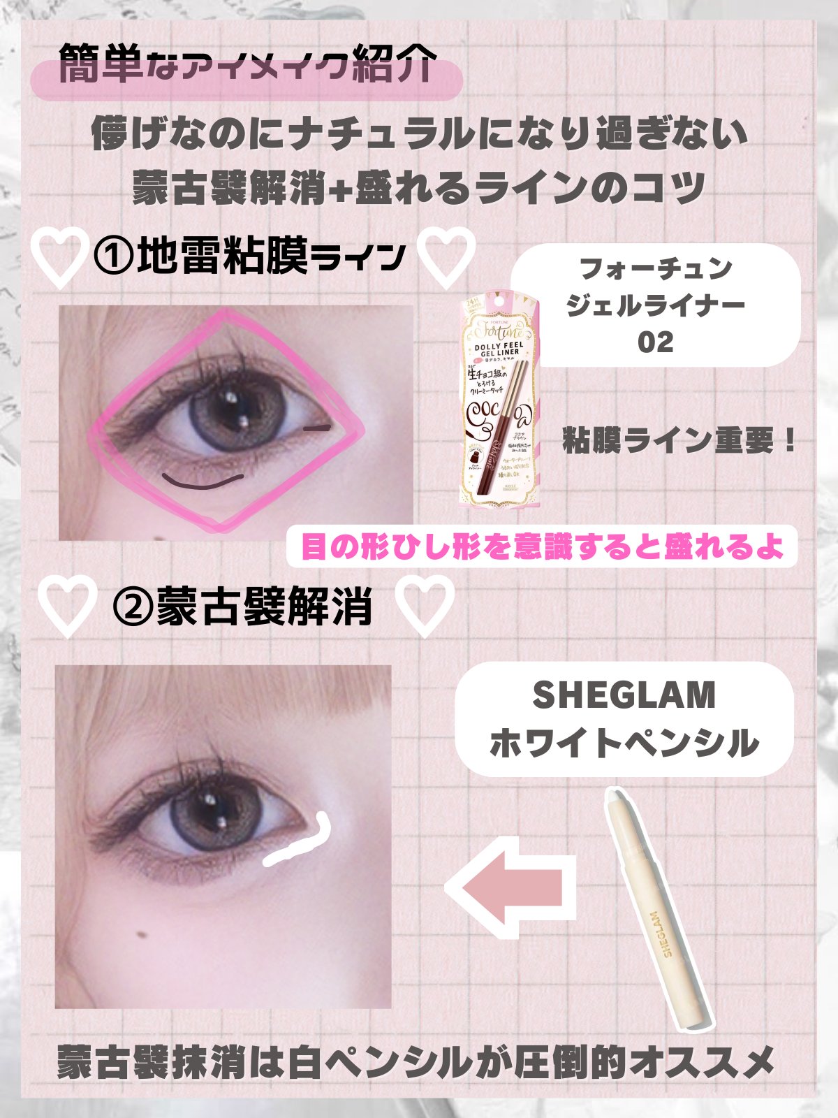 影▶Kirei&co.アイブロウパウダー03番 グレーよりのカラーで自分が思ってるよりもガッツリいれちゃって大丈夫! マットハイライト▶i’m memeカラーパターンパレット002 マットハイライトがマジ大事!この工程が無いと凹凸感は出ないよ ハイライト▶キャンメイクグロウフルールチークス16 これも真っ白じゃないものを使ってるけど、ココは真っ白ハイライトでも大丈夫〇