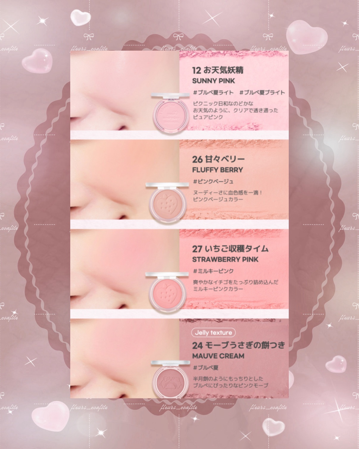 - <01 CALM PINK(おうち時間)> タルク、マイカ、メタクリル酸メチルクロスポリマー、リンゴ酸ジイソステアリル、ステアロイルオキシステアリン酸オクチルドデシル、野菜油、ジメチコン、ミリスチン酸Mg、ミリスチン酸イソセチル、水酸化Al、1,2-ヘキサンジオール、カプリル酸グリセリル、水添レシチン、メチコン、ヘリクリスムイタリクム花水、ベンジルアルコール、デヒドロ酢酸、黄4、マンガンバイオレット、酸化チタン、赤226、酸化鉄、グンジョウ <02 ミルクティー気分(MILKTEA CORAL)> タルク、マイカ、メタクリル酸メチルクロスポリマー、リンゴ酸ジイソステアリル、ステアロイルオキシステアリン酸オクチルドデシル、野菜油、ジメチコン、ミリスチン酸Mg、ミリスチン酸イソセチル、水酸化Al、1,2-ヘキサンジオール、カプリル酸グリセリル、水添レシチン、メチコン、ヘリクリスムイタリクム花水、ベンジルアルコール、デヒドロ酢酸、黄4、酸化チタン、酸化鉄、赤226 <04 HAZEL ORANGE(おべんきょモード)> タルク、マイカ、メタクリル酸メチルクロスポリマー、リンゴ酸ジイソステアリル、ステアロイルオキシステアリン酸オクチルドデシル、野菜油、ジメチコン、ミリスチン酸Mg、ミリスチン酸イソセチル、水酸化Al、1,2-ヘキサンジオール、カプリル酸グリセリル、水添レシチン、ヘリクリスムイタリクム花水、ベンジルアルコール、デヒドロ酢酸、酸化鉄、赤226 <05 DUSKY ROSE(おしゃべりタイム)> タルク、マイカ、メタクリル酸メチルクロスポリマー、ステアロイルオキシステアリン酸オクチルドデシル、リンゴ酸ジイソステアリル、野菜油、ジメチコン、ミリスチン酸Mg、ミリスチン酸イソセチル、水酸化Al、1,2-ヘキサンジオール、カプリル酸グリセリル、水添レ シチン、メチコン、ヘリクリスムイタリクム花水、ベンジルアルコール、デヒドロ酢酸、酸化鉄、酸化チタン、赤226 <06 MORNING BLUSH(朝寝坊だいすき)> タルク、マイカ、メタクリル酸メチルクロスポリマー、合成フルオロフロゴパイト、リンゴ酸ジイソステアリル、ステアロイルオキシ ステアリン酸オクチルドデシル、野菜油、ミリスチン酸Mg、ジメチコン、ミリスチン酸イソセチル、1,2-ヘキサンジオール、カプリル酸 グリセリル、水酸化Al、水添レシチン、酸化スズ、メチコン、トリエトキシカプリリルシラン、(+/-)、酸化チタン、赤226、マンガン バイオレット、酸化鉄、グンジョウ、黄4 <07 MILKY PEACH(ヨーグルトもぐもぐ)> タルク、マイカ、メタクリル酸メチルクロスポリマー、リンゴ酸ジイソステアリル、ステアロイルオキシステアリン酸オクチルドデシル、野菜油、ジメチコン、ミリスチン酸Mg、ミリスチン酸イソセチル、1,2-ヘキサンジオール、水酸化Al、カプリル酸グリセリル、水添レ シチン、メチコン、トリエトキシカプリリルシラン、酸化チタン、黄4、赤226、酸化鉄 <11 SUNNY PINK(ピクニックへ行こう)> タルク、マイカ、メタクリル酸メチルクロスポリマー、リンゴ酸ジイソステアリル、ステアロイルオキシステアリン酸オクチルドデシル、野菜油、ジメチコン、ミリスチン酸Mg、ミリスチン酸イソセチル、水酸化Al、1,2-ヘキサンジオール、カプリル酸グリセリル、水添レシチン、メチコン、トリエトキシカプリリルシラン、酸化チタン、黄4、赤226、酸化鉄 <12 PICNIC PINK(お天気妖精)> タルク、マイカ、メタクリル酸メチルクロスポリマー、リンゴ酸ジイソステアリル、ステアロイルオキシステアリン酸オクチルドデシル、野菜油、ジメチコン、ミリスチン酸Mg、ミリスチン酸イソセチル、1,2-ヘキサンジオール、水酸化Al、カプリル酸グリセリル、水添レシチン、メチコン、トリエトキシカプリリルシラン、酸化チタン、黄4、赤226、酸化鉄、グンジョウ <13 NICE PINK> タルク、マイカ、メタクリル酸メチルクロスポリマー、リンゴ酸ジイソステアリル、ステアロイルオキシステアリン酸オクチルドデシル、野菜油、ジメチコン、ミリスチン酸Mg、ミリスチン酸イソセチル、水酸化Al、1, 2-ヘキサンジオール、カプリル酸グリセリル、水添レ シチン、メチコン、トリエトキシカプリリルシラン、酸化チタン、マンガンバイオレット、黄4、赤226、グンジョウ、酸化鉄 <16 ACORN BEIGE> タルク、マイカ、メタクリル酸メチルクロスポリマー、リンゴ酸ジイソステアリル、ステアロイルオキシステアリン酸オクチルドデシル、トリ(カプリル酸/カプリン酸)グリセリル、ジメチコン、ミリスチン酸イソセチル、ミリスチン酸Mg、酸化チタン、1,2-ヘキサンジオー ル、水添アブラナ種子油、カプリル酸グリセリル、水酸化Al、水添レシチン、トリエトキシカプリリルシラン、メチコン、酸化鉄、赤226 <17 ROSY BROWN> タルク、マイカ、メタクリル酸メチルクロスポリマー、酸化チタン、リンゴ酸ジイソステアリル、ステアロイルオキシステアリン酸オ クチルドデシル、トリ(カプリル酸/カプリン酸)グリセリル、ジメチコン、ミリスチン酸イソセチル、ミリスチン酸Mg、1,2-ヘキサンジオー ル、水添アブラ