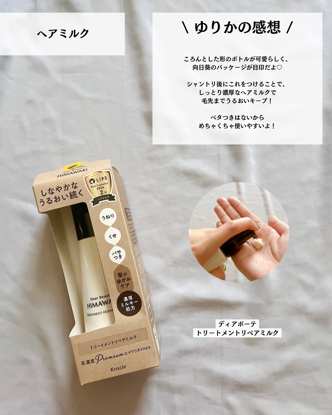 | ヘアケア・スタイリングランキング第29位 | 髪の毛がまとまりやすく、扱いやすくなった感じがして嬉しい🥰 べたつかないさらっと軽やかな使い心地で、手もべたつないから終始快適 | 詳細を見る | |