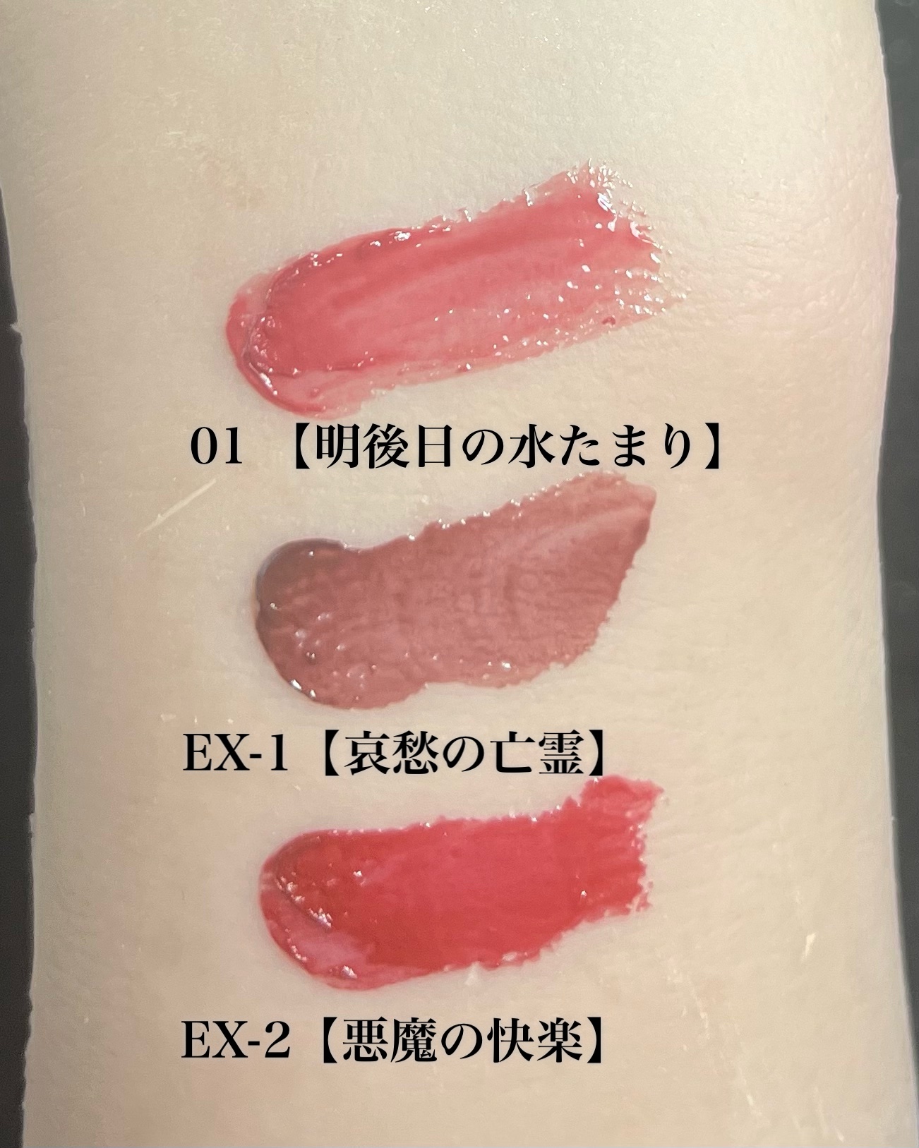 - <G01 明後日の水たまり> テトライソステアリン酸ジペンタエリスリチル、オクチルドデカノール、水添ポリイソブテン、トリ(カプリル酸/カプリン酸)グリセリル、ビスアルキル(C16-18)グリセリルウンデシルジメチコン、パラフィン、ダイマージリノール酸(フィトステリル/イソステアリル/セチル/ステアリル/ベヘニル)、ラウロイルグルタミン酸ジ(オクチルドデシル/フィトステリル/ベヘニル)、合成ワックス、マイクロクリスタリンワックス、ヒドロキシステアリン酸エチルヘキシル、トコフェロール、ホホバ種子油、オリーブ果実油、アーモンド油、ジメチコン、ヒアルロン酸Na、(+/-)ラウロイルアスパラギン酸Na、ラウロイルリシン、塩化亜鉛、酸化チタン、酸化鉄、水酸化Al、硫酸Ba、トリイソステアリン酸イソプロピルチタン、合成フルオロフロゴパイト、赤201、赤202 <G02 ピンクムーンの雫> テトライソステアリン酸ジペンタエリスリチル、オクチルドデカノール、水添ポリイソブテン、トリ(カプリル酸/カプリン酸)グリセリル、ビスアルキル(C16-18)グリセリルウンデシルジメチコン、パラフィン、ダイマージリノール酸(フィトステリル/イソステアリル/セチル/ステアリル/ベヘニル)、ラウロイルグルタミン酸ジ(オクチルドデシル/フィトステリル/ベヘニル)、合成ワックス、マイクロクリスタリンワックス、ヒドロキシステアリン酸エチルヘキシル、トコフェロール、ホホバ種子油、オリーブ果実油、アーモンド油、ジメチコン、ヒアルロン酸Na、(+/-)ラウロイルアスパラギン酸Na、ラウロイルリシン、塩化亜鉛、酸化チタン、酸化鉄、水酸化Al、硫酸Ba、トリイソステアリン酸イソプロピルチタン、合成フルオロフロゴパイト、赤201、赤202 <G03 99.9°C> テトライソステアリン酸ジペンタエリスリチル、オクチルドデカノール、水添ポリイソブテン、トリ(カプリル酸/カプリン酸)グリセリル、ビスアルキル(C16-18)グリセリルウンデシルジメチコン、パラフィン、ダイマージリノール酸(フィトステリル/イソステアリル/セチル/ステアリル/ベヘニル)、ラウロイルグルタミン酸ジ(オクチルドデシル/フィトステリル/ベヘニル)、合成ワックス、マイクロクリスタリンワックス、ヒドロキシステアリン酸エチルヘキシル、トコフェロール、ホホバ種子油、オリーブ果実油、アーモンド油、ジメチコン、ヒアルロン酸Na、(+/-)ラウロイルアスパラギン酸Na、ラウロイルリシン、塩化亜鉛、酸化チタン、酸化鉄、水酸化Al、硫酸Ba、トリイソステアリン酸イソプロピルチタン、合成フルオロフロゴパイト、赤201、赤202 <G04 スパイダー リリー調香師> テトライソステアリン酸ジペンタエリスリチル、オクチルドデカノール、水添ポリイソブテン、トリ(カプリル酸/カプリン酸)グリセリル、ビスアルキル(C16-18)グリセリルウンデシルジメチコン、パラフィン、ダイマージリノール酸(フィトステリル/イソステアリル/セチル/ステアリル/ベヘニル)、ラウロイルグルタミン酸ジ(オクチルドデシル/フィトステリル/ベヘニル)、合成ワックス、マイクロクリスタリンワックス、ヒドロキシステアリン酸エチルヘキシル、リンゴ酸ジイソステアリル、トコフェロール、ホホバ種子油、オリーブ果実油、アーモンド油、ジメチコン、ヒアルロン酸Na、(+/-)(チタン/酸化チタン)焼結物、ラウロイルアスパラギン酸Na、ラウロイルリシン、塩化亜鉛、酸化チタン、酸化鉄、水酸化Al、トリイソステアリン酸イソプロピルチタン、トリエトキシカプリリルシラン、合成フルオロフロゴパイト、青1、赤202 <G05 ピンク ロビンの泉> テトライソステアリン酸ジペンタエリスリチル、オクチルドデカノール、水添ポリイソブテン、トリ(カプリル酸/カプリン酸)グリセリル、ビスアルキル(C16-18)グリセリルウンデシルジメチコン、パラフィン、ダイマージリノール酸(フィトステリル/イソステアリル/セチル/ステアリル/ベヘニル)、ラウロイルグルタミン酸ジ(オクチルドデシル/フィトステリル/ベヘニル)、合成ワックス、マイクロクリスタリンワックス、ヒドロキシステアリン酸エチルヘキシル、リンゴ酸ジイソステアリル、トコフェロール、ホホバ種子油、オリーブ果実油、アーモンド油、ジメチコン、ヒアルロン酸Na、(+/-)(チタン/酸化チタン)焼結物、ラウロイルアスパラギン酸Na、ラウロイルリシン、塩化亜鉛、酸化チタン、酸化鉄、水酸化Al、トリイソステアリン酸イソプロピルチタン、トリエトキシカプリリルシラン、合成フルオロフロゴパイト、青1、赤202 <EX-1 哀愁の亡霊 (限定色)> テトライソステアリン酸ジペンタエリスリチル、オクチルドデカノール、水添ポリイソブテン、トリ(カプリル酸/カプリン酸)グリセリル、ビスアルキル(C16-18)グリセリルウンデシルジメチコン、パラフィン、ダイマージリノール酸(フィトステリル/イソステアリル/セチル/ステアリル/ベヘニル)、ラウロイルグルタミン酸ジ(オクチルドデシル/フィトステリル/ベヘニル)、合成ワックス、マイクロクリスタリンワックス