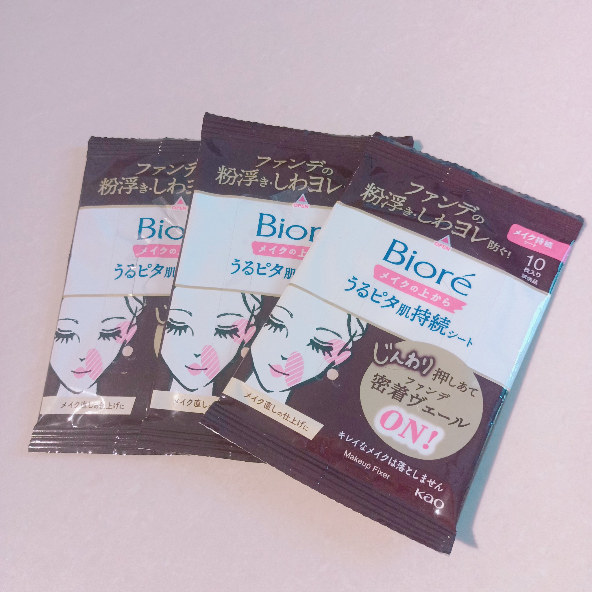 ビオレ様より商品提供していだたきました。Bioreメイクの上からうるピタ肌持続シート10枚入試供品試供品なので10枚入ですがコスパ良さげ◎《特徴》ファンデの粉浮き・しわヨレ防ぐ朝のメイクを密着ロック*¹!*¹うるピタ肌続く:シートによるメイク...
