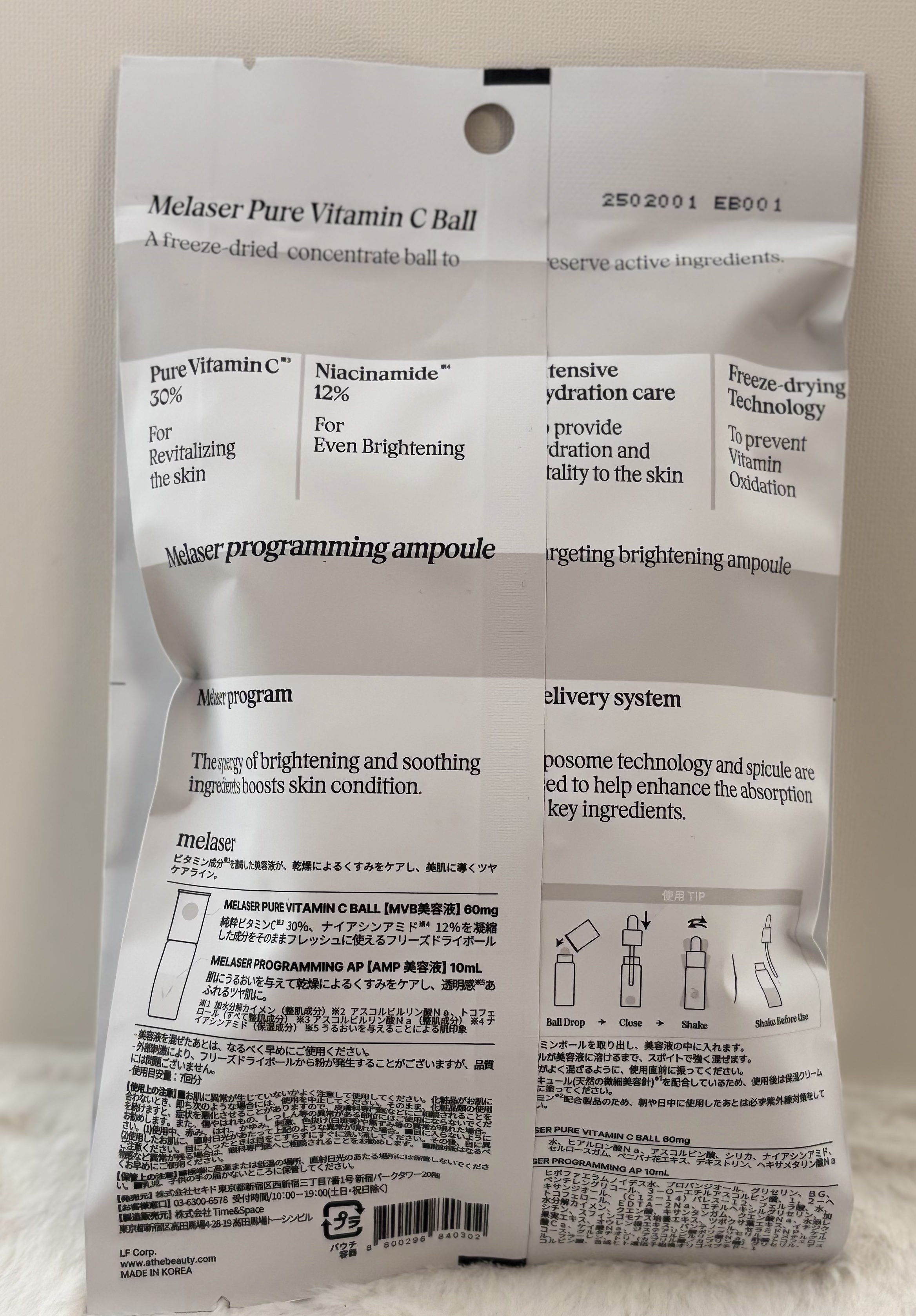 - 【MELASER PURE VITAMIN C BALL】 水、ヒアルロン酸Na、アスコルビン酸、シリカ、ナイアシンアミド、セルロースガム、ベニバナ花エキス、デキストリン、ヘキサメタリン酸Na 【MELASER PROGRAMMING AP】 ヒポファエラムノイデス水、プロパンジオール、グリセリン、BG、ペンチレングリコール、3-O-エチルアスコルビン酸、1,2-ヘキサンジオール、(C12-14)パレス-12、フェルラ酸、水、トコフェロール、EDTA-2Na、エチルヘキシルグリセリン、加水分解カイメン、クエン酸、キサンタンガム、クエン酸Na、水添レシチン、スフィンゴモナス培養エキス、ツボクサ葉エキス、イチジク果実エキス、オウレン根エキス、パンテノール、セラミドNP、ケイ酸Ca、ケイ酸Na、ジステアリン酸ポリグリセリル-3メチルグルコース、グルタチオン、アスコルビルリン酸Na、酢酸トコフェロール、フラーレン、トリ(カプリル酸/カプリン酸)グリセリル、アスコルビン酸、合成ヒト遺伝子組換オリゴペプチド-1