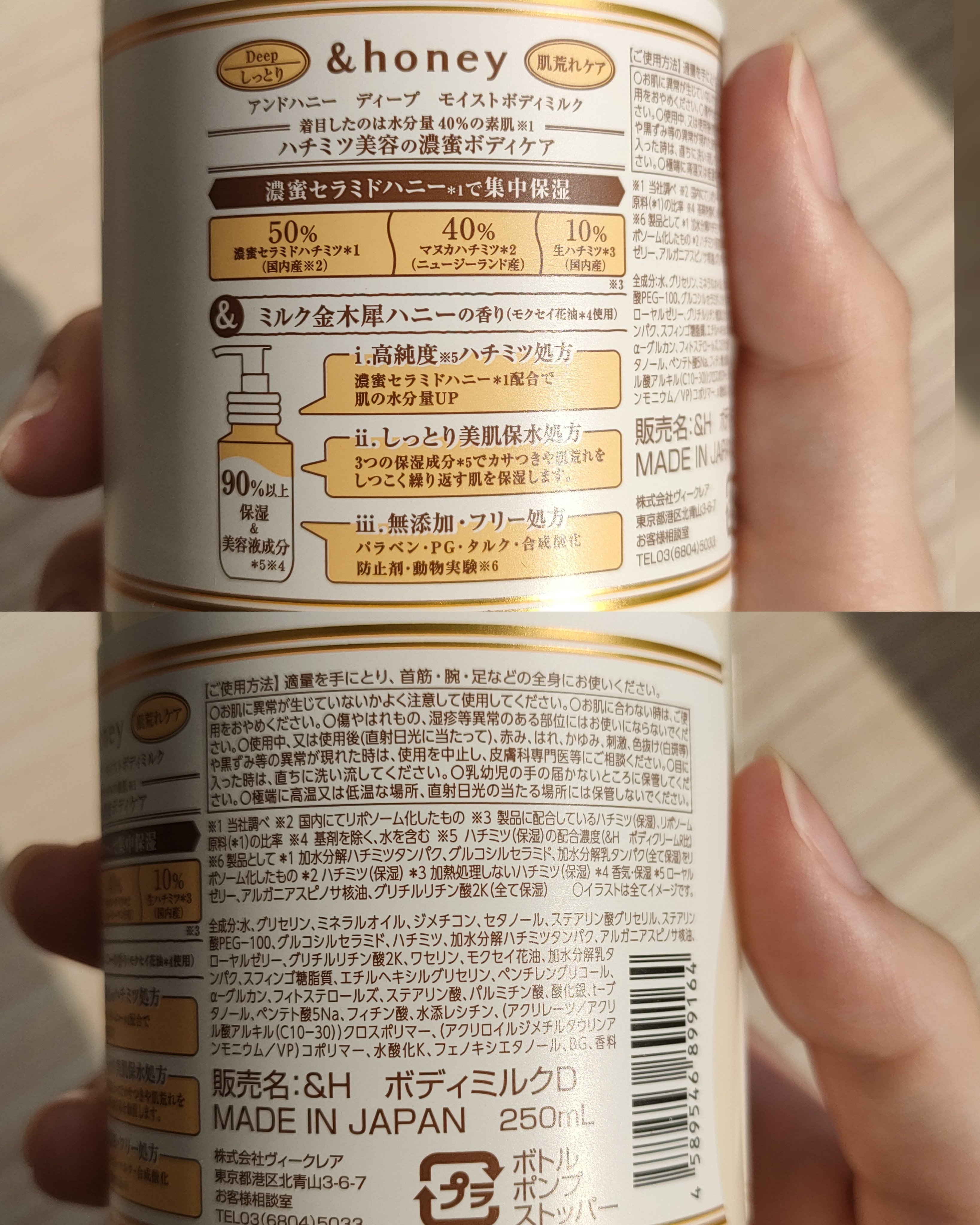- <250mL> 水、グリセリン、ミネラルオイル、ジメチコン、セタノール、ステアリン酸グリセリル、ステアリン酸PEG-100、ハチミツ、加水分解ハチミツタンパク、グルコシルセラミド、加水分解乳タンパク、アルガニアスピノサ核油、ローヤルゼリー、グリチルリチン酸2K、モクセイ花油、スフィンゴ糖脂質、ワセリン、エチルヘキシルグリセリン、ペンチレングリコール、αーグルカン、フィトステロールズ、ステアリン酸、パルミチン酸、酸化銀、t-ブタノール、ペンテト酸5Na、フィチン酸、水添レシチン、(アクリレーツ/アクリル酸アルキル(C10-30))クロスポリマー、(アクリロイルジメチルタウリンアンモニウム/VP)コポリマー、水酸化K、フェノキシエタノール、BG、香料