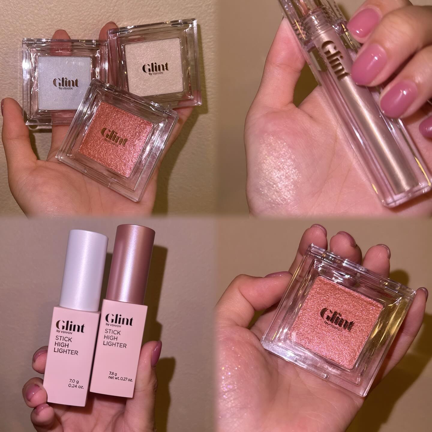 Glintの人気ハイライトとチークをスウォッチしたよ🌸🌸🌸🥰Glint グリントハイライター01DewyMoon/03ChromeBaby/04MilkyMoon/05PitchMoon/AngelPeach(新作)ベイクドブラッシュ04Tu...