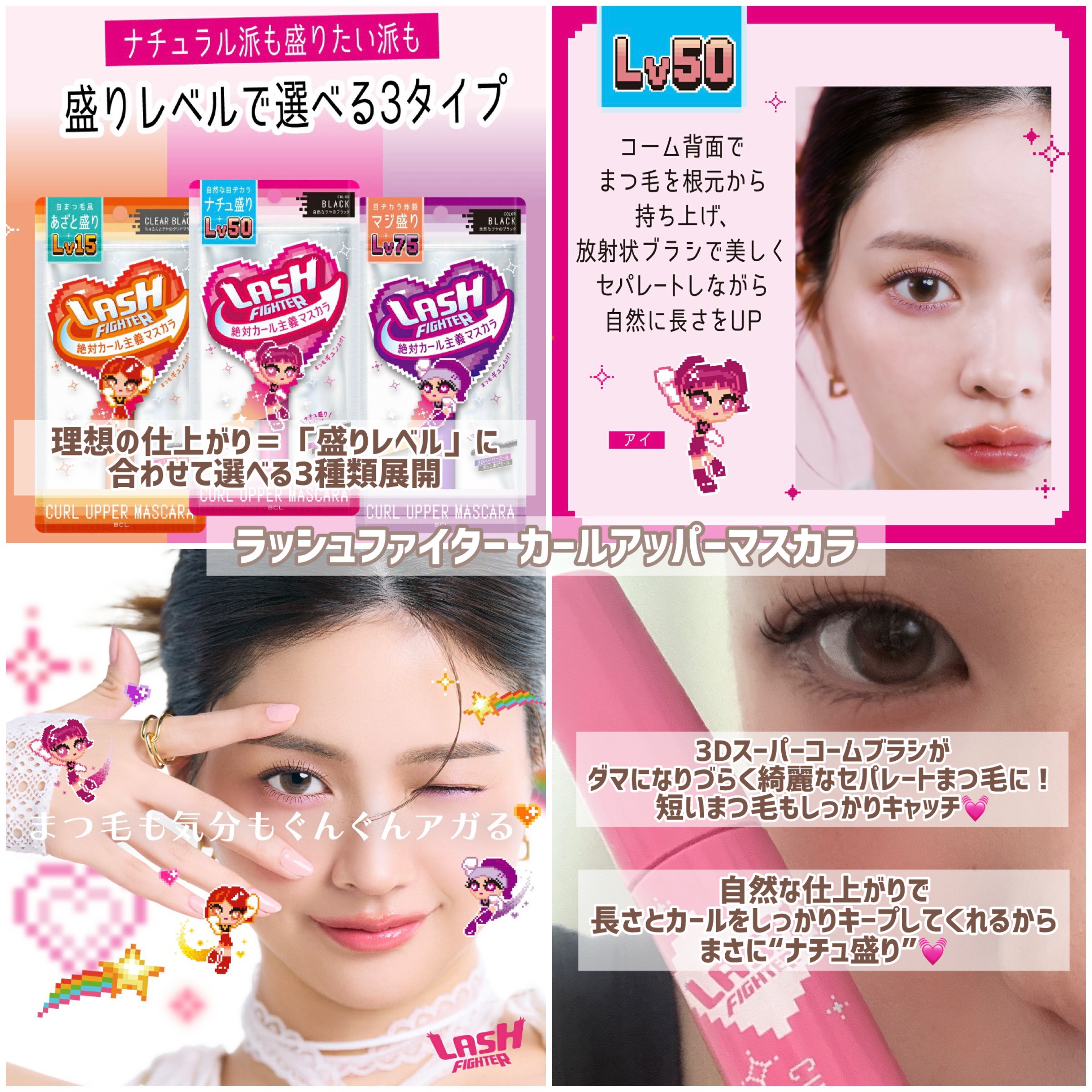 - 下向きまつ毛もくるんとギュン上げ! 瞬時にカールをロックする皮膜剤*配合で、メイクしたてのカールを長時間キープ。 Lv50は自然な目ヂカラのナチュ盛り仕様。 コーム背面でまつ毛を根元から持ち上げ、放射状ブラシで美しくセパレートしながら根元から印象をUPします。 汗・皮脂・水に強いウォータープルーフ処方。 まつ毛美容液成分配合:パンテノール、加水分解ケラチン(羊毛)、加水分解シルク(以上、すべて保湿) *トリメチルシロキシケイ酸 2025/8/20先行発売