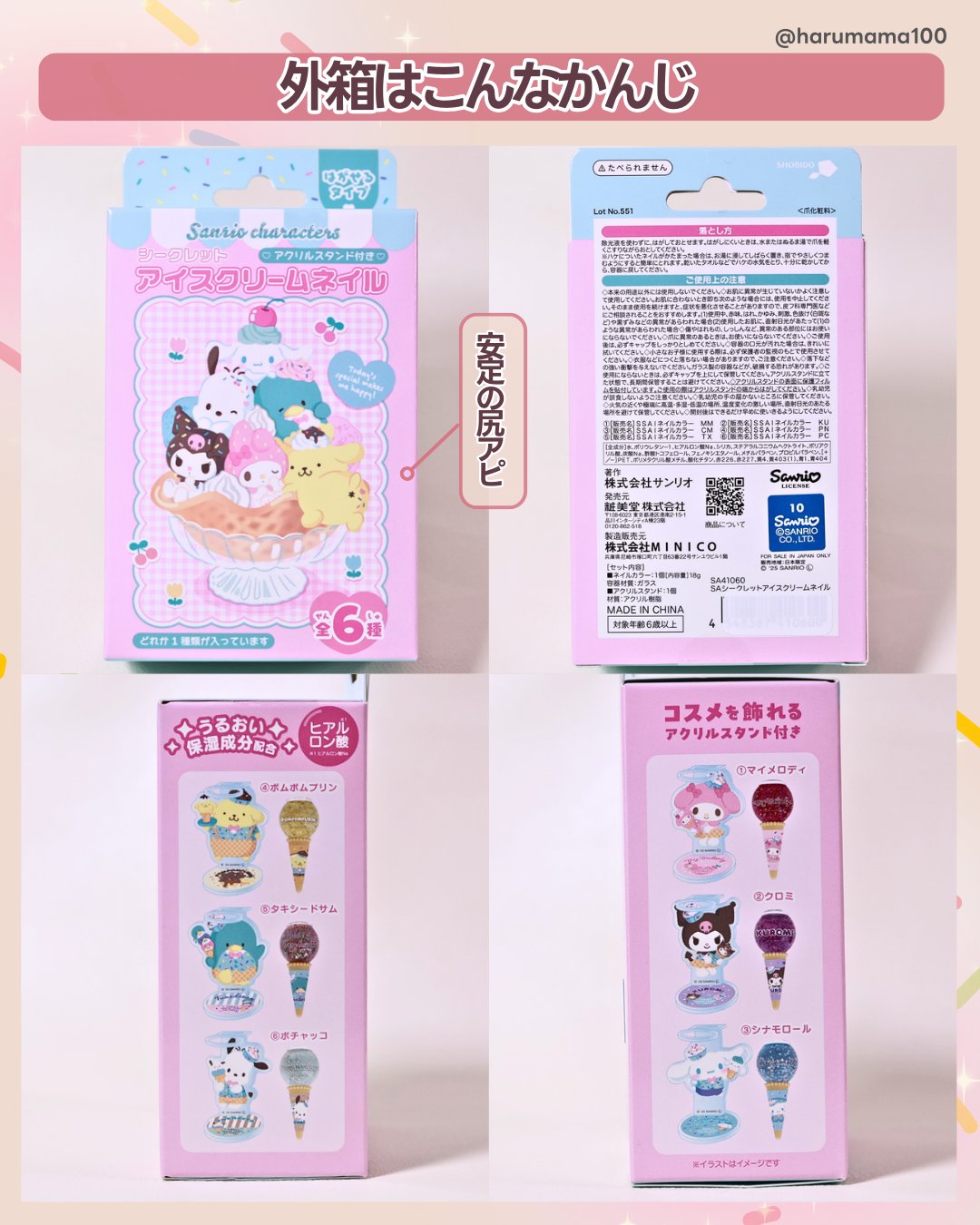 - サンリオキャラクターズより、アイスクリームネイルが登場! コスメを飾れるアクリルスタンド付き。 本物のアイスそっくりなネイルで、爪を可愛くできちゃう♪ ⚠たべられません 【全6種類】どれが出るかはお楽しみ! ①マイメロディ ②クロミ ③シナモロール ④ポムポムプリン ⑤タキシードサム ⑥ポチャッコ うるおい保湿成分配合 ヒアルロン酸 ※1 ※1 ヒアルロン酸Na 【セット内容】 ・ネイルカラー:1個 [内容量] 18g ・アクリルスタンド:1個 【落とし方】 除光液を使わずに、はがしておとせます。 はがしにくいときは、水またはぬるま湯で爪を軽くこすりながらおとしてください。 ※ハケについたネイルがかたまった場合は、お湯に浸してしばらく置き、指でやさしくつまむようにすると簡単にとれます。乾いたタオルなどでハケの水気をとり、十分に乾かしてから、容器に戻してください。 【ご使用上の注意】 ◇本来の用途以外には使用しないでください。 ◇お肌に異常が生じていないかよく注意して使用してください。お肌に合わないとき即ち次のような場合には、使用を中止してください。そのまま使用を続けますと、症状を悪化させることがありますので、皮フ科専門医などにご相談されることをおすすめします。 (1) 使用中、赤味、はれ、かゆみ、刺激、色抜け(白斑など)や黒ずみなどの異常があらわれた場合 (2)使用したお肌に、直射日光があたって(1)のような異常があらわれた場合傷やはれもの、しっしんなど、異常のある部位にはお使いにならないでください。 ◇爪に異常のあるときは、お使いにならないでください。 ◇ご使用後は、必ずキャップをしっかりとしめてください。 ◇容器の口元が汚れた場合は、きれいに拭いてください。 ◇小さなお子様に使用する際は、必ず保護者の監視のもとで使用させてください。 ◇衣服などにつくと落ちない場合がありますので、ご注意ください。 ◇落下などの強い衝撃を与えないでください。ガラス製の容器などが、破損する恐れがあります。 ◇ご使用にならないときは、必ずキャップを上にして保管してください。アクリルスタンドに立てた状態で、長期間保管することは避けてください。 ◇アクリルスタンドの表面に保護フィルムを貼付しています。 ご使用の際はアクリルスタンドの端からはがしてください。 ◇乳幼児が誤食しないようご注意ください。 ◇乳幼児の手の届かないところに保管してください。 ◇火気の近くや極端に高温・多湿・低温の場所、 温度変化の激しい場所、直射日光のあたる場所を避けて保管してください。 ◇開封後はできるだけ早めに使いきるようにしてください。