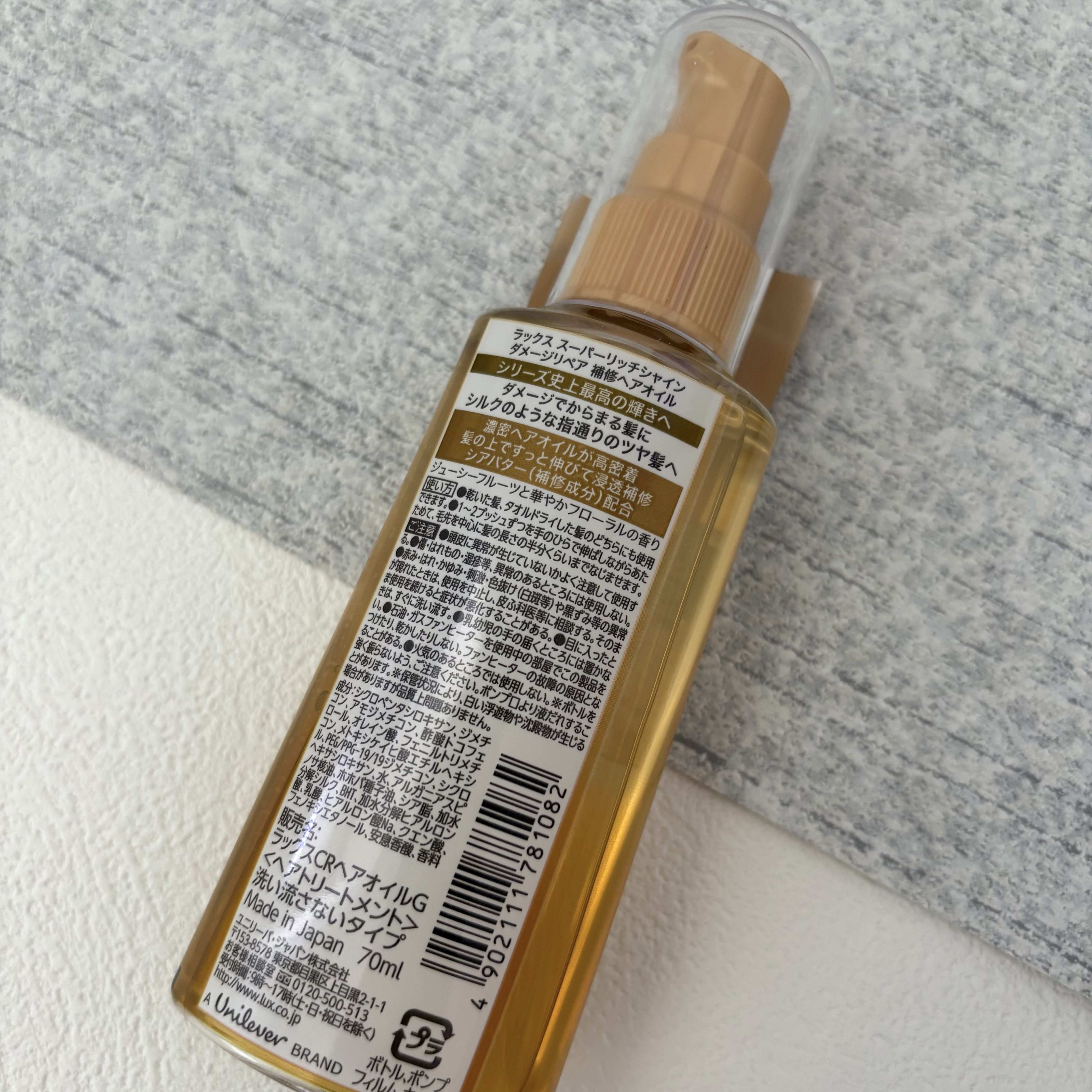 ラックス スーパーリッチシャイン ダメージリペア 補修ヘアオイルさらっとしたテクスチャーが髪に馴染んでいい感じです◎ベタつかないのと軽いつけ心地で私はタオルドライしたあとに使用しています。ジューシーフルーツと華やかなフローラルの香りがお気に入...