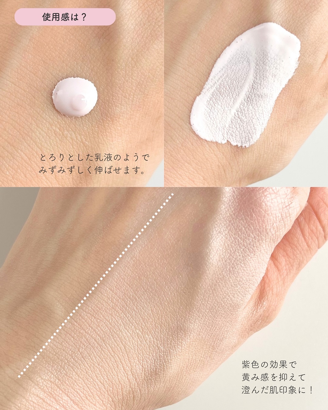 ベージュの方がなじみがよく、肌から浮く感じは皆無で自然にトーンアップできます。 すごく軽い使い心地ですが、なじみのいいカラーのおかげでより毛穴や色むらなどのアラをきれいにカバーできるように感じました。 ラベンダーは、肌の黄み感がかなり抑えられる印象! 透明感を求めるなら圧倒的にこちらで、色白に見えるように感じました。 黄みをカバーできるおかげで、苦手な青みピンクのリップやチークが似合う肌になれたので、ブルベメイクもしたいイエベさんにはラベンダーがおすすめです✨