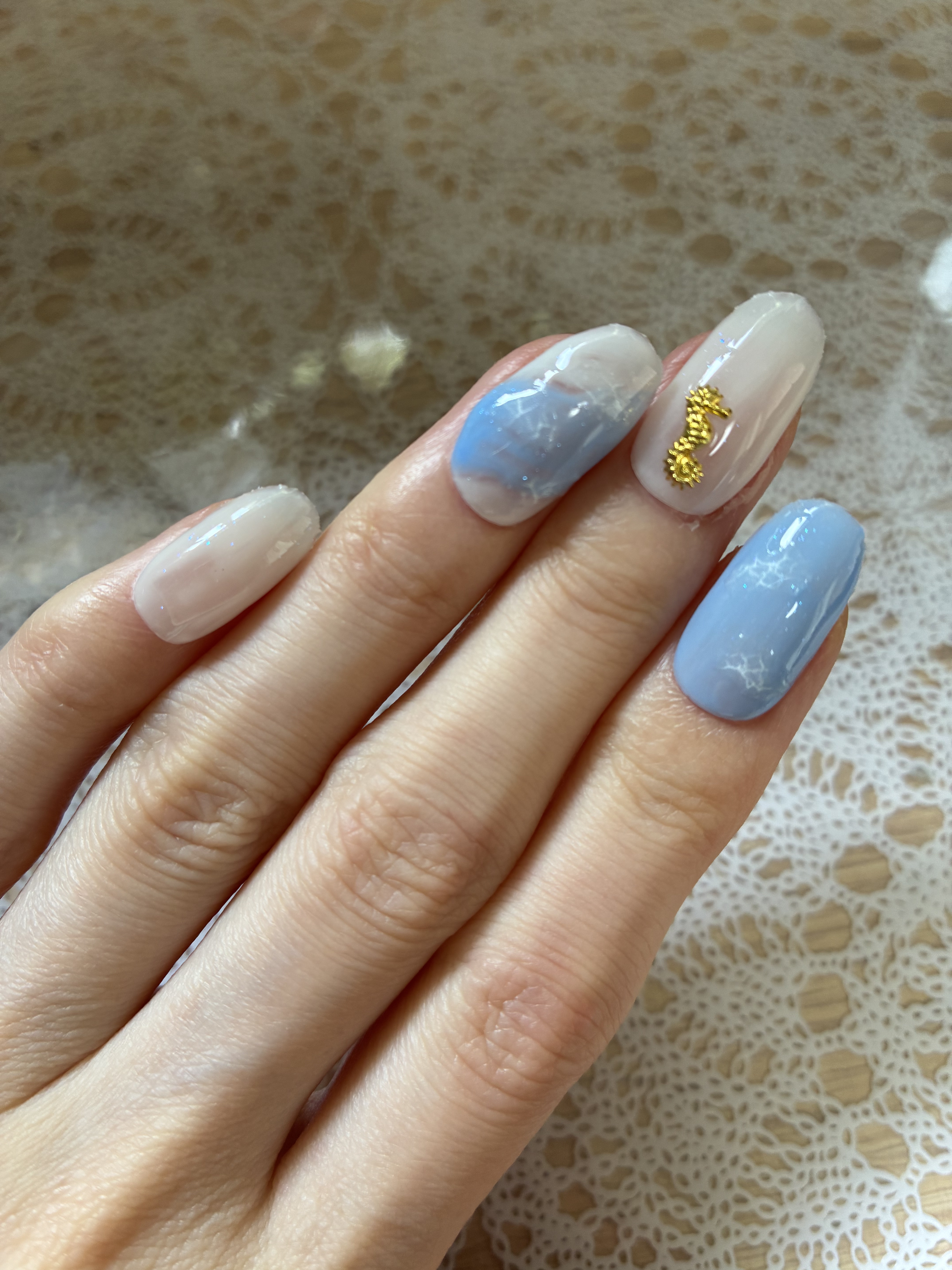 ほぼ百均ゆらゆらクラゲネイル🪼✼••┈┈••✼••┈┈••✼••┈┈••✼••┈┈••✼ピールオフベースを塗ったあと①親指、中指、薬指にアイボリー、人差し指と小指にオリエンタルブルーを塗る②人差し指と薬指にはフローズンシルバーを重ね、中指はブ...
