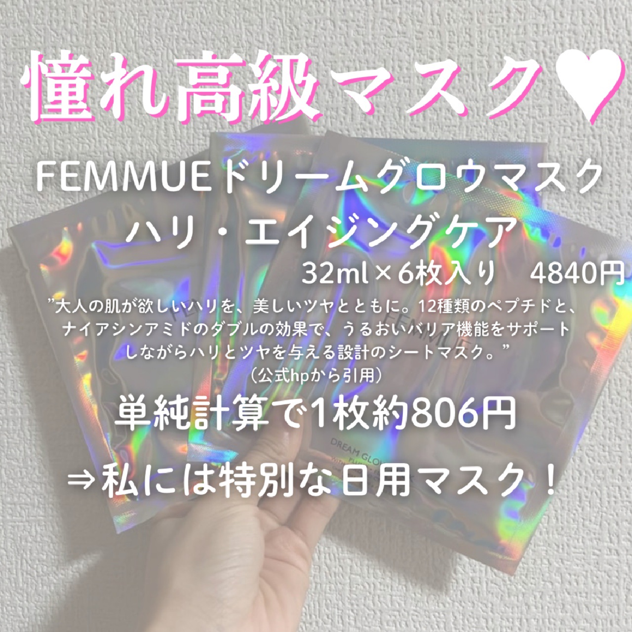 FEMMUEのDREAMGLOWMASK🫧ミルクっぽい美容液が染み込んだトゥルトゥルな質感のシートで、めちゃくちゃ密着してくれます!結論から言うと、保湿力すごすぎて感動、、、こりゃプレゼントでもらったら嬉しい🥹ちょっとシートが固めなので、口周...