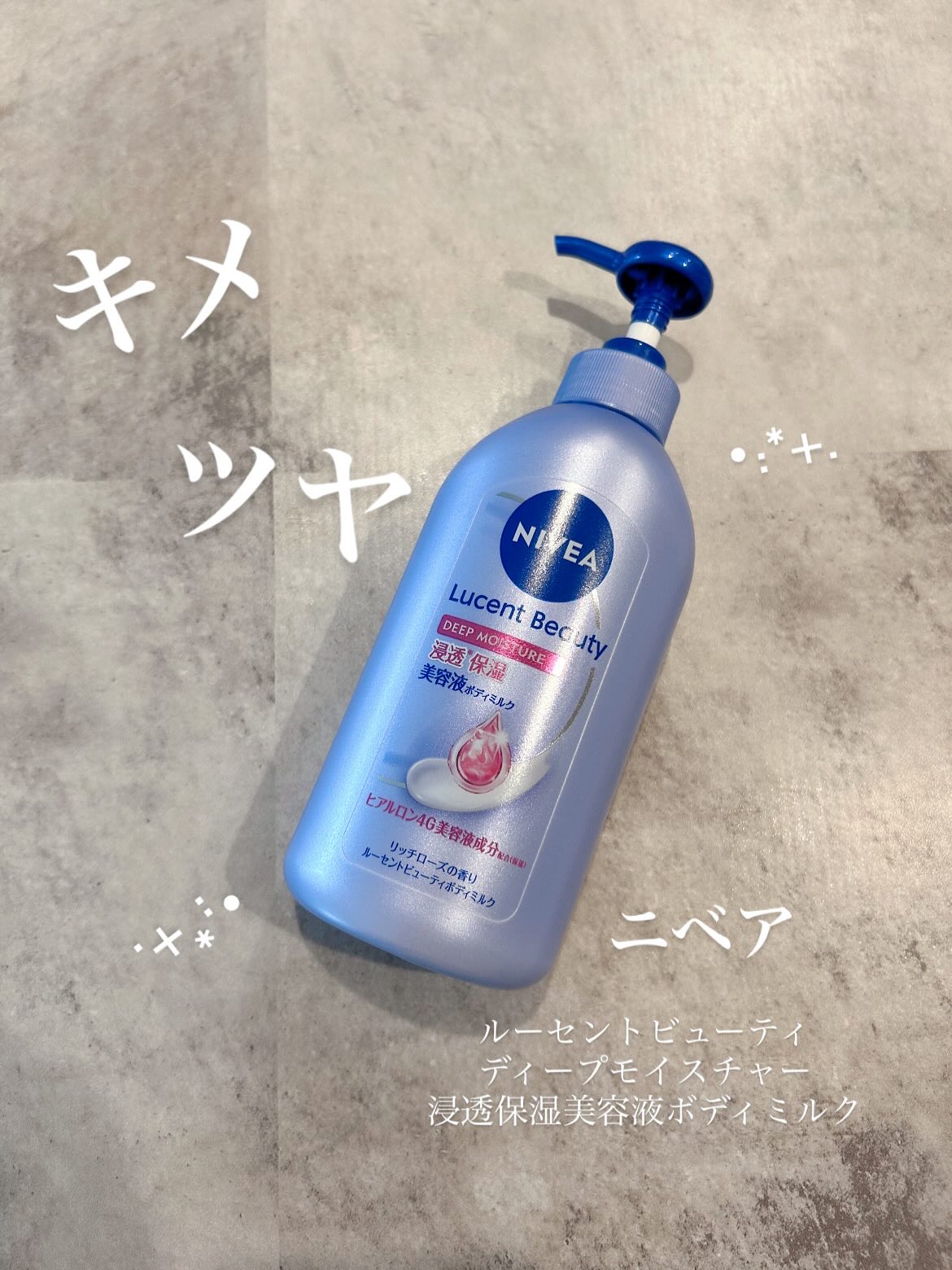 - うるおって透明感あふれる美肌へ導く、高保湿美容液ボディミルクシリーズ。 ニベアが考えるボディの美肌の鍵「キメ・つや・なめらかさ」にアプローチ。 うるおいに満ちて透明感のある肌に導く。ヒアルロン4G美容液成分※1 配合(保湿) キメが整ってなめらかで艶やかなうるおい透明美肌に。美容液ミルクが角層深部に浸透し、うるおいが長続き。 浸透ヒアルロン成分配合:浸透型※2ヒアルロン酸※3、グリセリン(すべて保湿) 気分満たされる、華やかで上質なリッチローズの香り ※1 ヒアルロン酸Na、グリセリン、グリコーゲン、グリセリルグルコシド、グルコサミン ※2 角層まで ※3 加水分解ヒアルロン酸