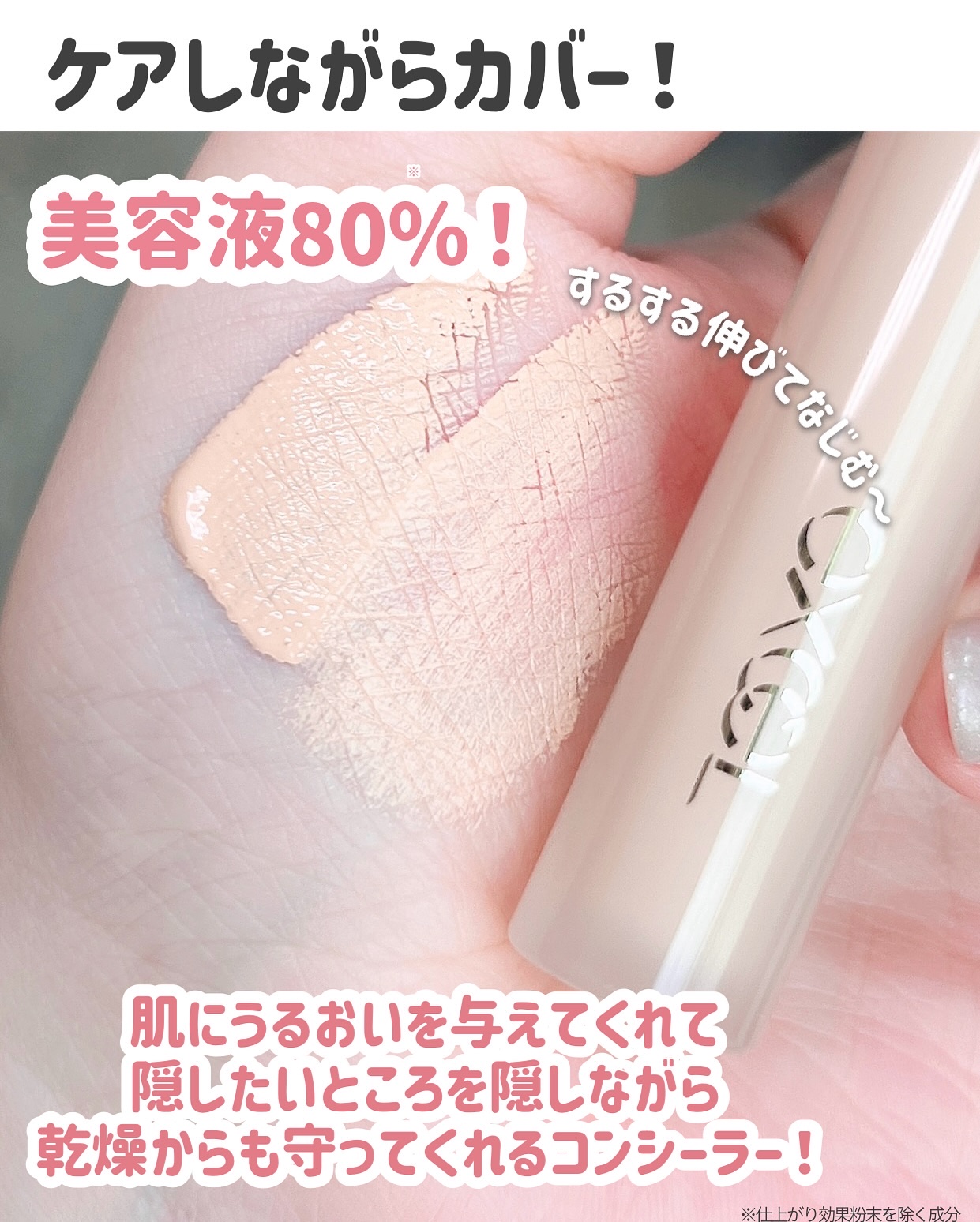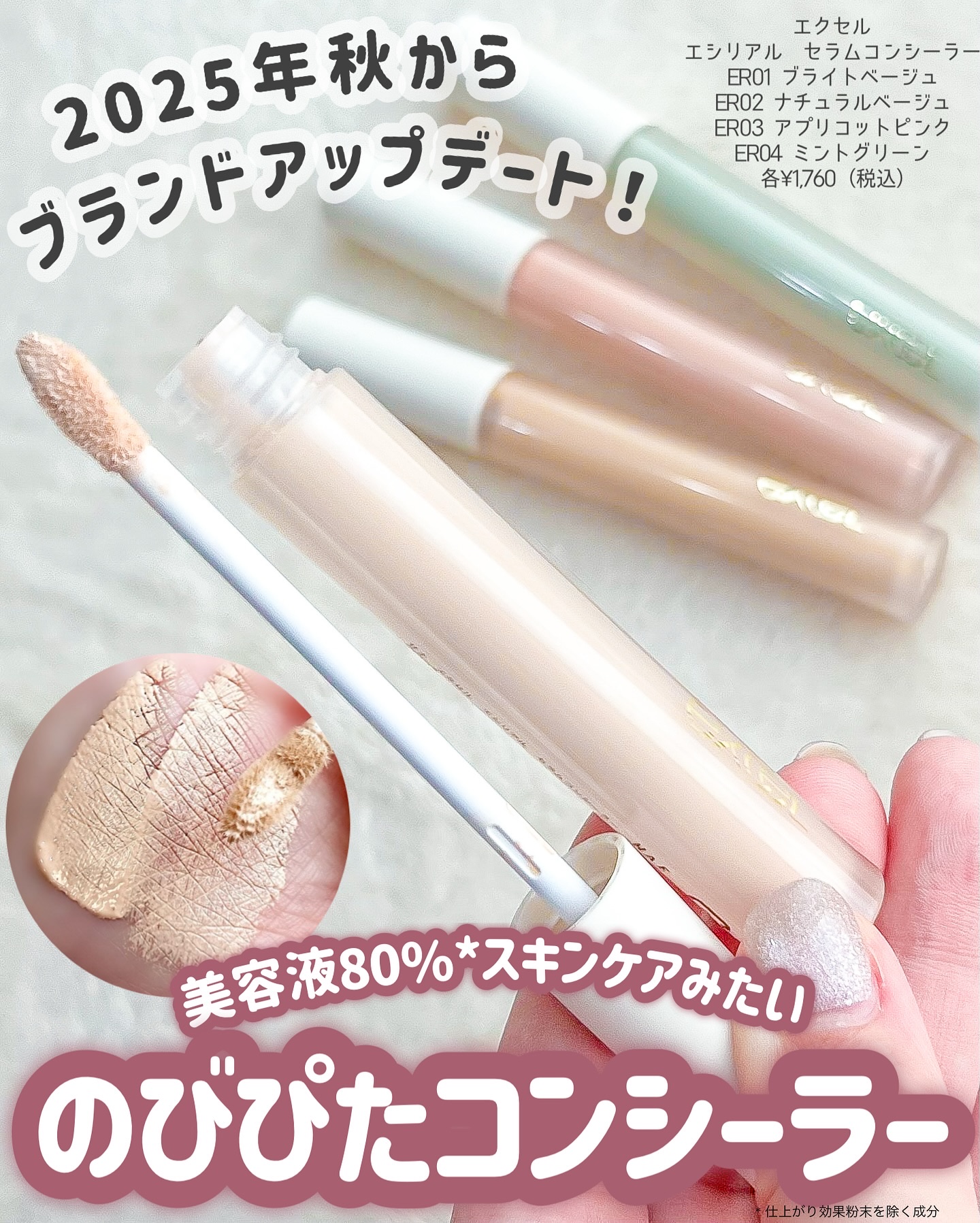 - 肌悩みに寄り添い自信に変える ケアしながらカバーする美容液コンシーラー 1. 美容液 80%*1。うるおいながら乾燥からまもります。 色別の肌悩みに合わせて厳選したこだわりのケア成分を配合しました。 2. ハイカバーなのに薄く軽い付け心地で表情の動きにフィット。 お肌になりすますような自然な仕上がりで、1 日中崩れません。 3. 細かい部分も広い部分も塗りやすいオリジナルスマートチップ。 指で塗っているような感覚でお肌にフィットします。 *1 仕上がり効果粉末を除く成分 ◆2025年8月5日よりエクセル公式オンラインショップ、Amazon にて先行販売