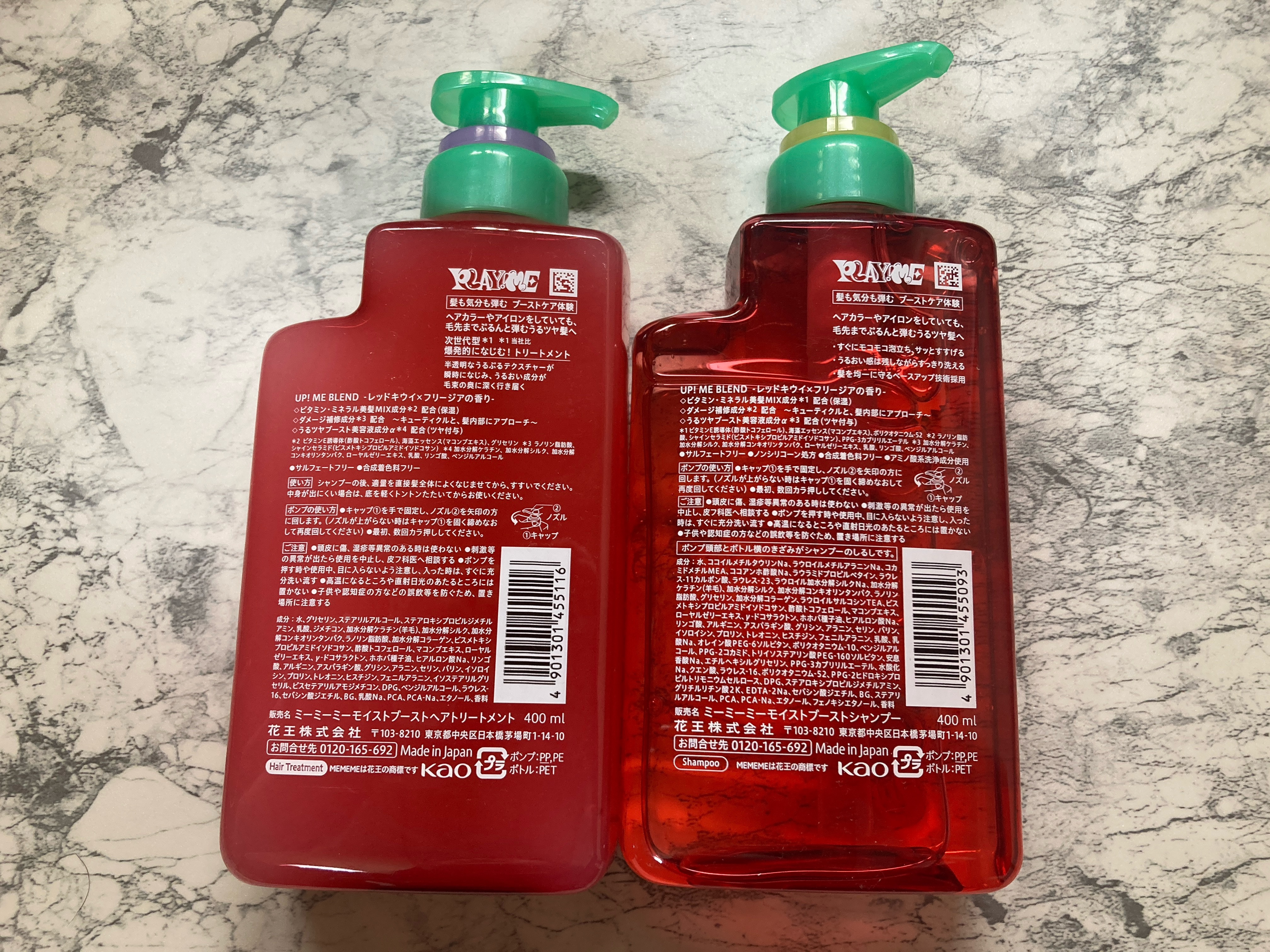 - ヘアカラーやアイロンをしていても、毛先までぷるんと弾む自信がみなぎるうるツヤ髪へ 【モイストブーストシャンプー】 ・すぐにモコモコ泡立ち、サッとすすげる! ・うるおい感は残しながらすっきり洗える ・髪を均一に守るベースアップ技術採用 【モイストブーストトリートメント】 次世代型*¹ 素早く一気になじむトリートメント。 ・半透明なうるぷるテクスチャーが瞬時になじみ、うるおい成分が毛束のすみずみまで行き届く ●サルフェートフリー ●合成着色料フリー シャンプーのみ:●ノンシリコーン処方 ●アミノ酸系洗浄成分使用*² UP! ME BLEND レッドキウイ×フリージアの香り ◇ビタミン・ミネラル美髪MIX成分*³配合(保湿) ◇うるツヤブースト美容液成分α*⁴配合(ツヤ付与) ◇ダメージ補修成分*⁵ ~キューティクルと、髪内部にアプローチ~ *1 花王内 *2 ココイルメチルタウリンNa、ラウロイルメチルアラニンNa、ラウロイルサルコシンTEA *3 ビタミンE誘導体(酢酸トコフェロール)、海藻エッセンス(マコンブエキス)、ポリクオタニウム-52(シャンプーのみ)、グリセリン(トリートメントのみ) *4 加水分解ケラチン、加水分解シルク、加水分解コンキオリンタンパク、ローヤルゼリーエキス、乳酸、リンゴ酸、ベンジルアルコール *5 ラノリン脂肪酸、シャインセラミド(ビスメトキシプロピルアミドイソドコサン)、PPG-3カプリリルエーテル(シャンプーのみ)