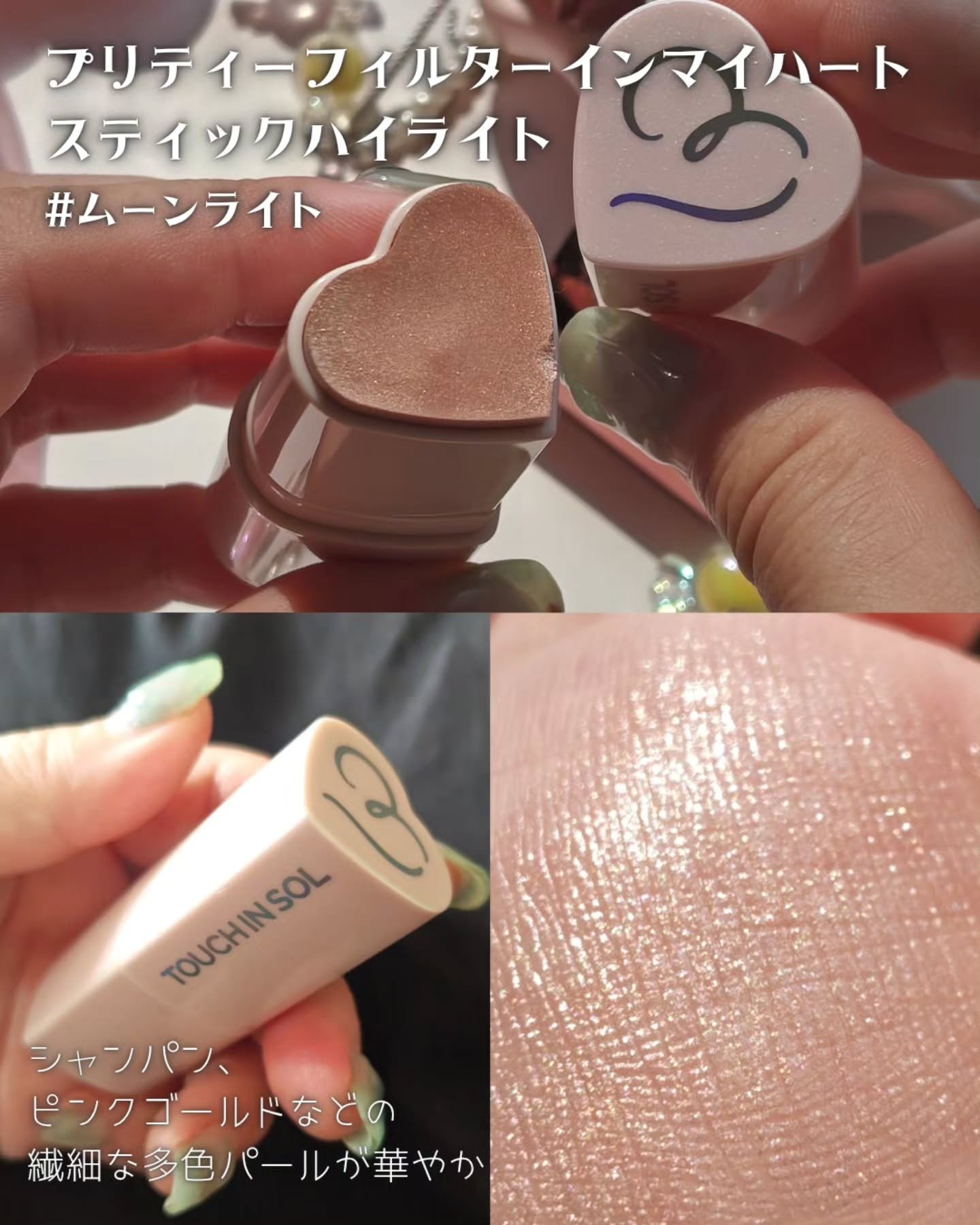 TouchinSOL🎀ハイライター#ムーンライト🎀チークブラッシャー#サンセットコーラル韓国アイドルみたいな#ツヤ玉ほっぺを作るならコレ!パッケージもハート型で可愛いハイライターとチーク💓シアバター・ビタミンEなどの成分が配合されていて、高...